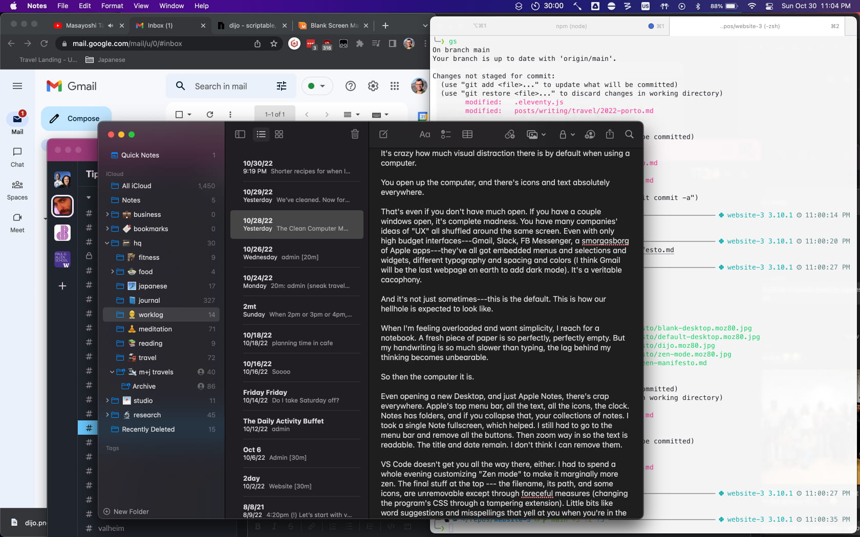 The most radical was closing my email inbox. I think I’ve had it open since 2011. I never want to close it. I don’t want to “miss something.” What would I possibly miss? This realization let me also close Slack, Messages, and others I felt I “had to have up.”