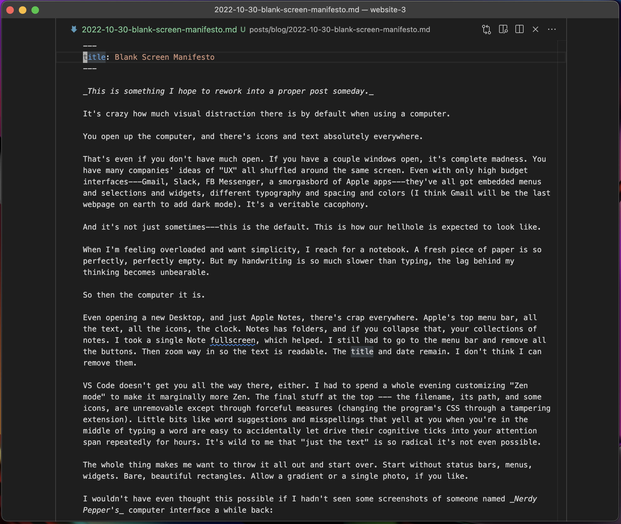 VS Code doesn’t get you all the way there, either. I had to spend a whole evening customizing “Zen mode” to make it marginally more Zen. The final stuff at the top—the filename, its path, and some icons—are unremovable except through forceful measures (changing the program’s CSS through a tampering extension).01 Little bits like word suggestion popups and misspelling squiggles that yell at you when you’re in the middle of typing a word are easy to accidentally let drive their cognitive ticks into your attention span repeatedly for hours. It’s wild to me that “just the text” is so radical it’s not even possible.