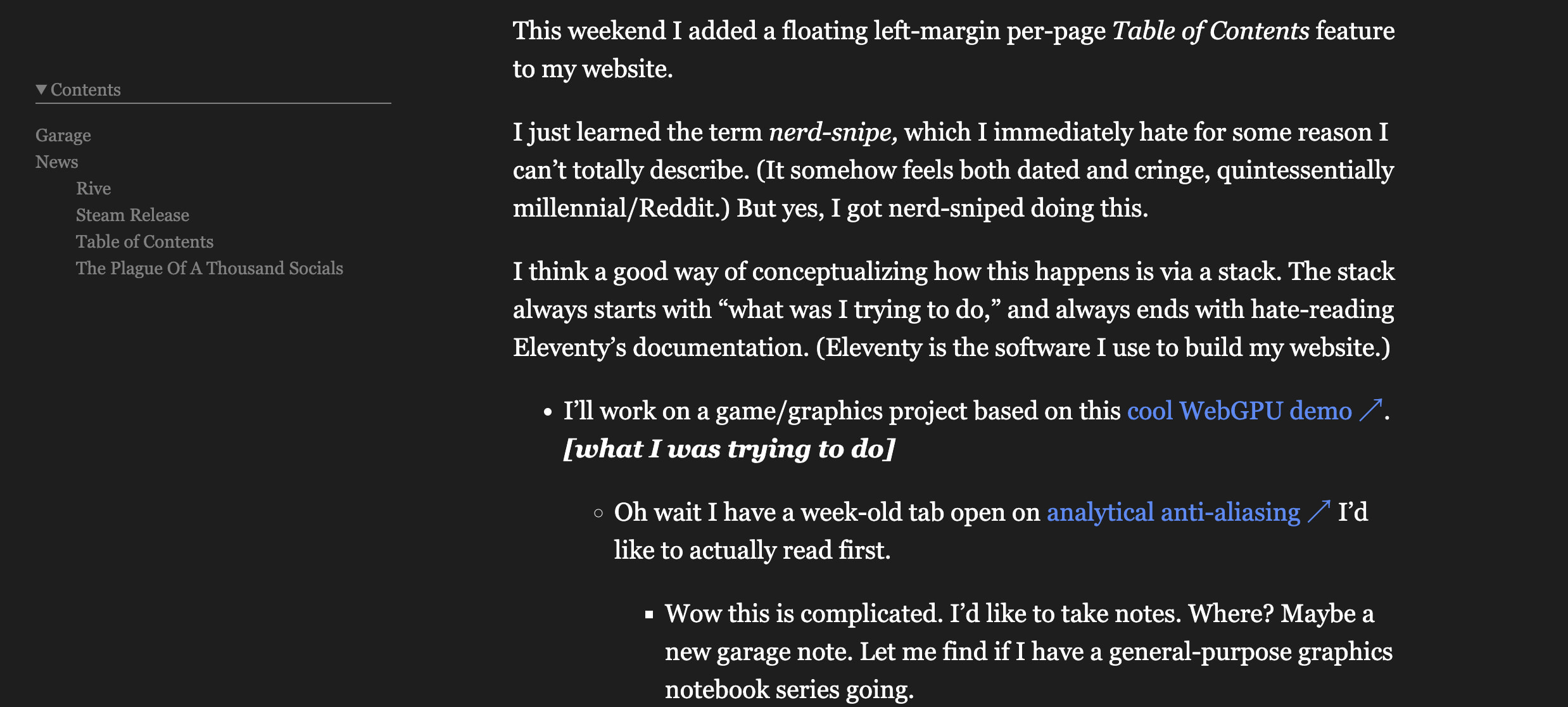 Five layers of side quests deep, I eventually managed to finish the table of contents sidebar. I never worked on the game/graphics project. Maybe next weekend.