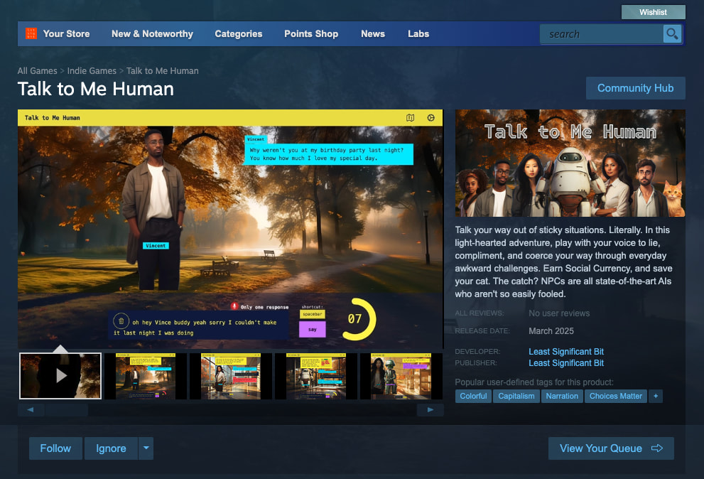 The persuade AIs game I’ve been working on—Talk to Me Human—has a “coming soon” Steam page now. Hooray! I’m aiming to participate in the Steam Next Fest at the end of February (2025).