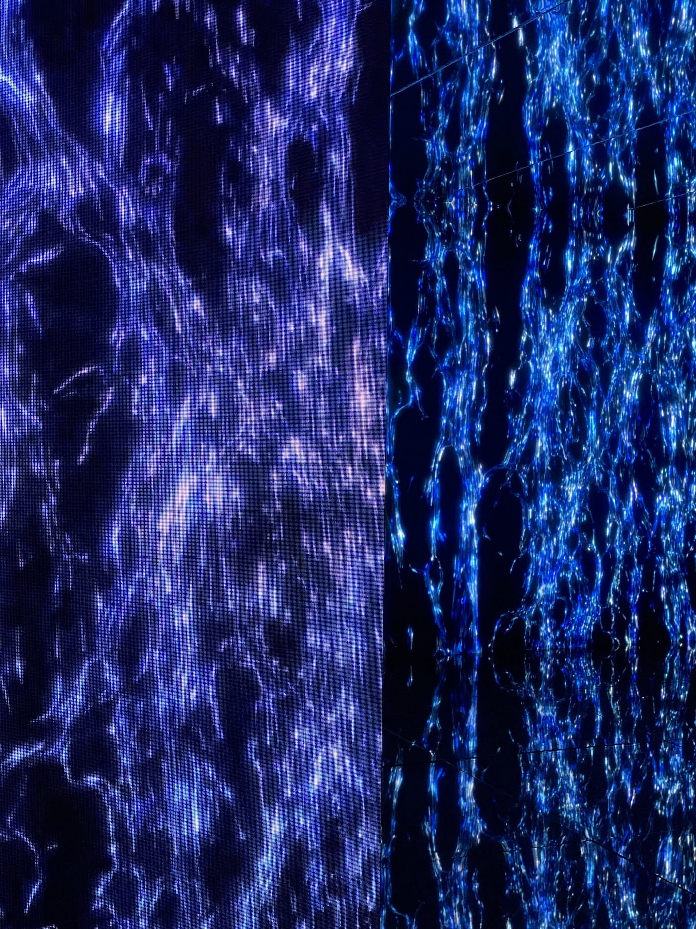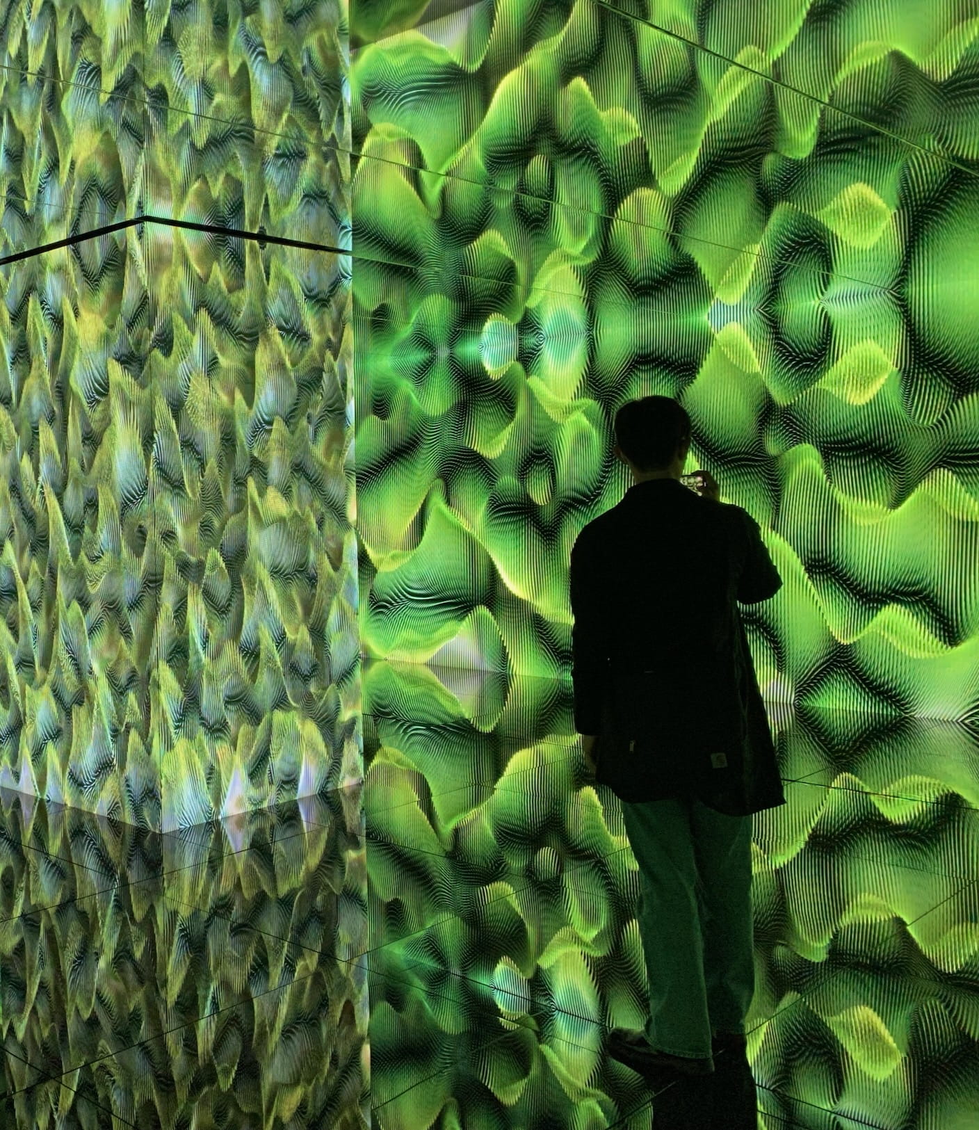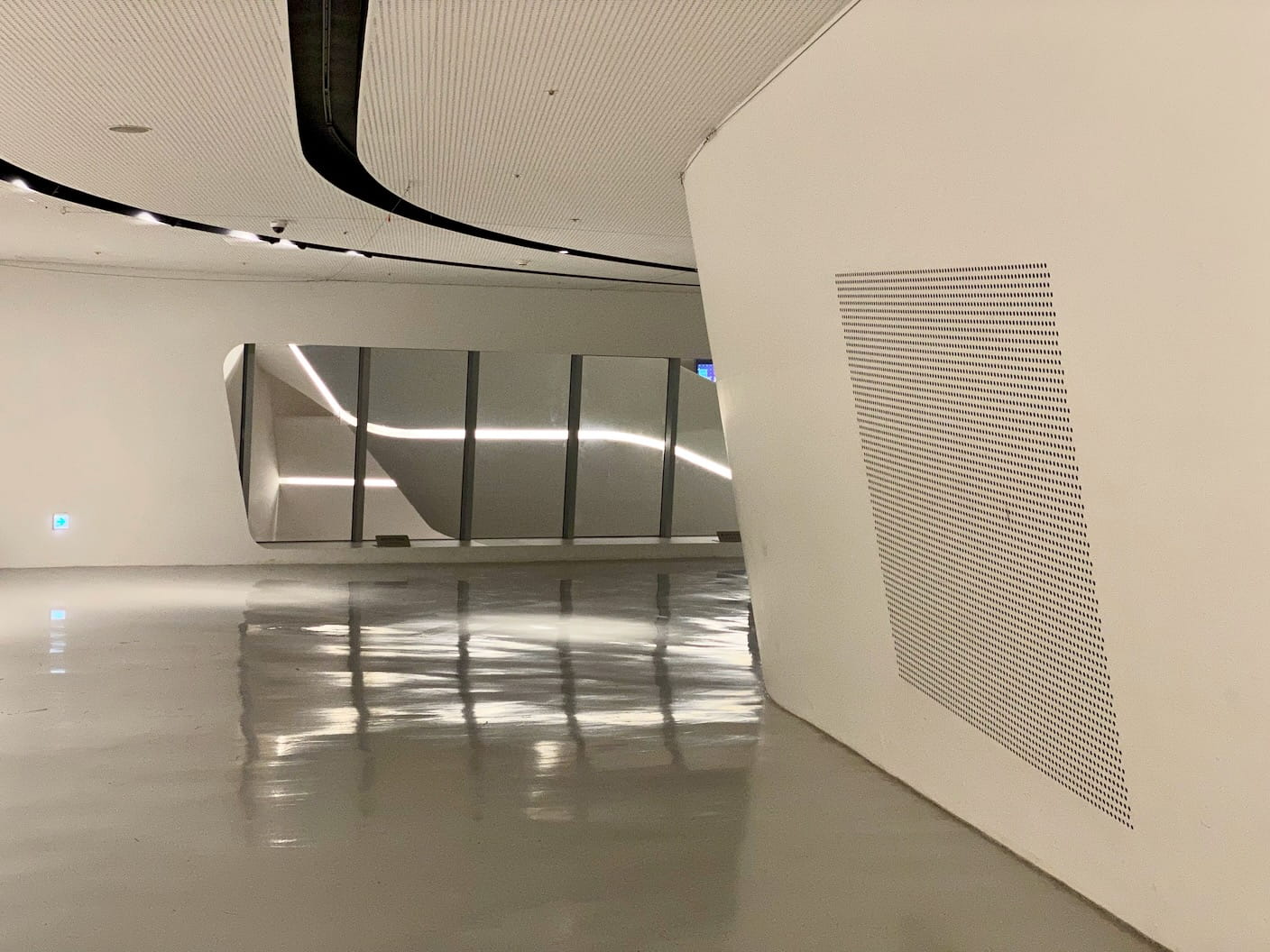 The piece—a multi-room tour with light projections, screens, and accompanying audio—immediately smells like high-production corporate art. (This made sense in hindsight; leaving, I saw the exhibit is funded by Kia, the car manufacturer.) The framerates are good, the choreography is energetic and crisp, and the audio belongs in a decent superhero movie. At times I felt like I was somehow watching K-pop but in abstract projected 3D renders.