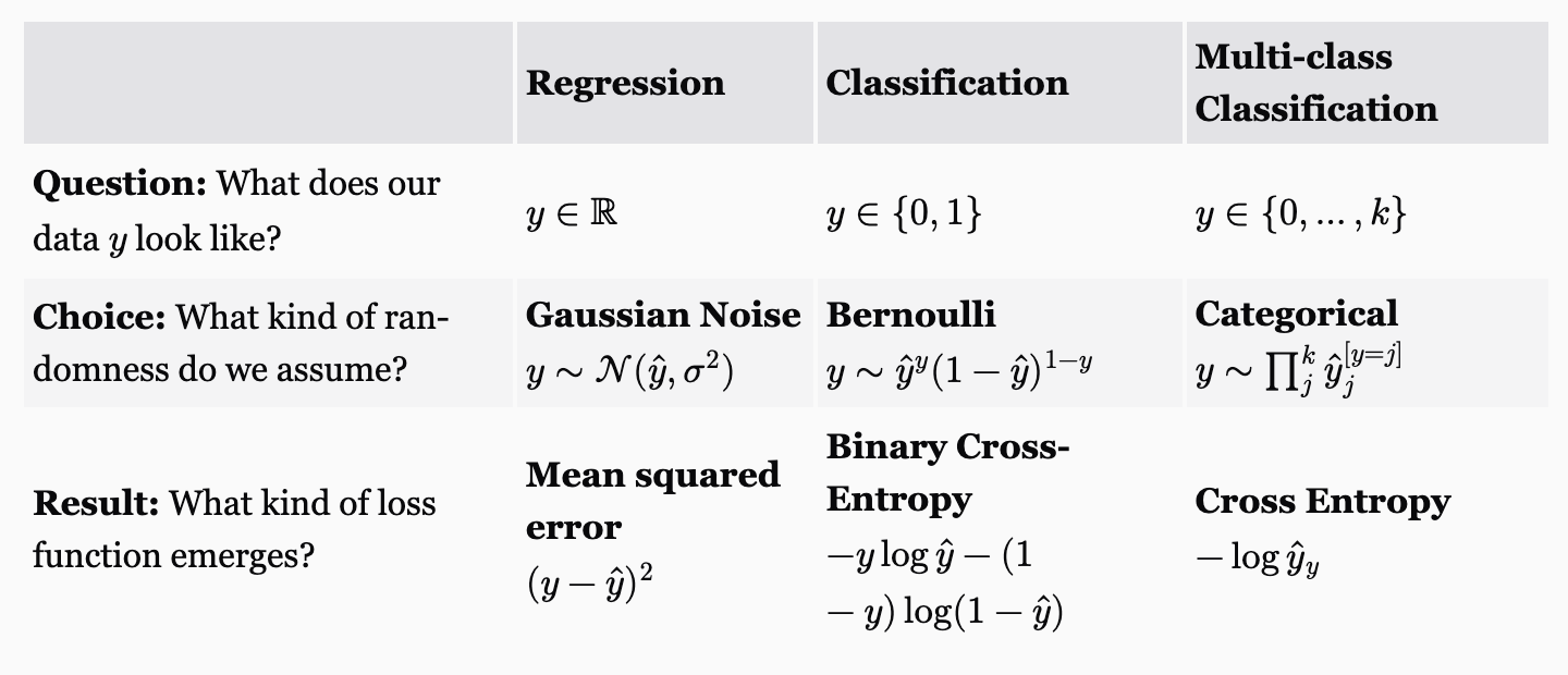 But listen. First, establish a very generic setup: write down how likely any data is under any model. Then, MLE does an amazing thing: ask just two questions (1) what do our outputs y look like? (2) what kind of randomness do we assume? And from this, the everyday loss functions like mean squared error and cross entropy just fall out.