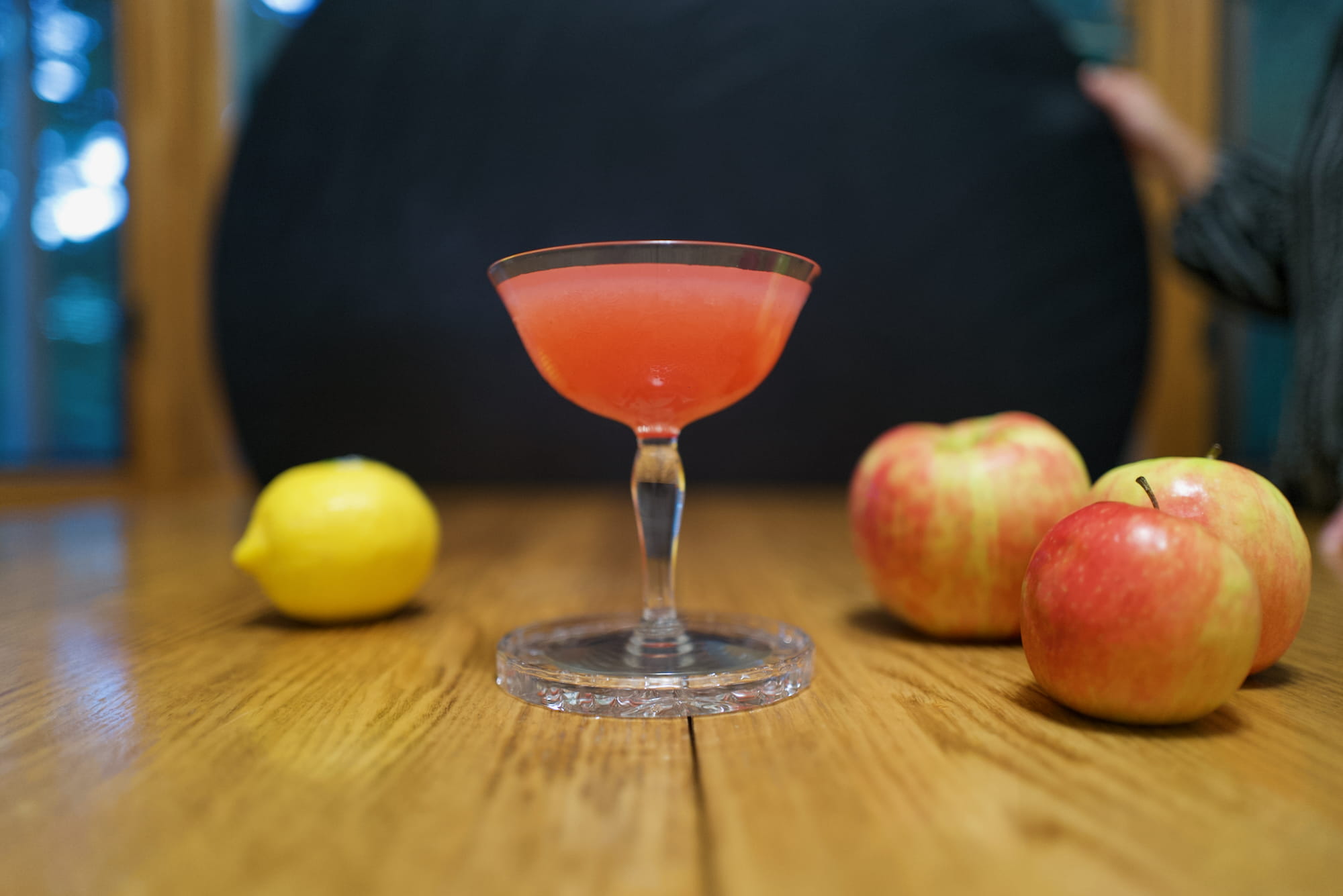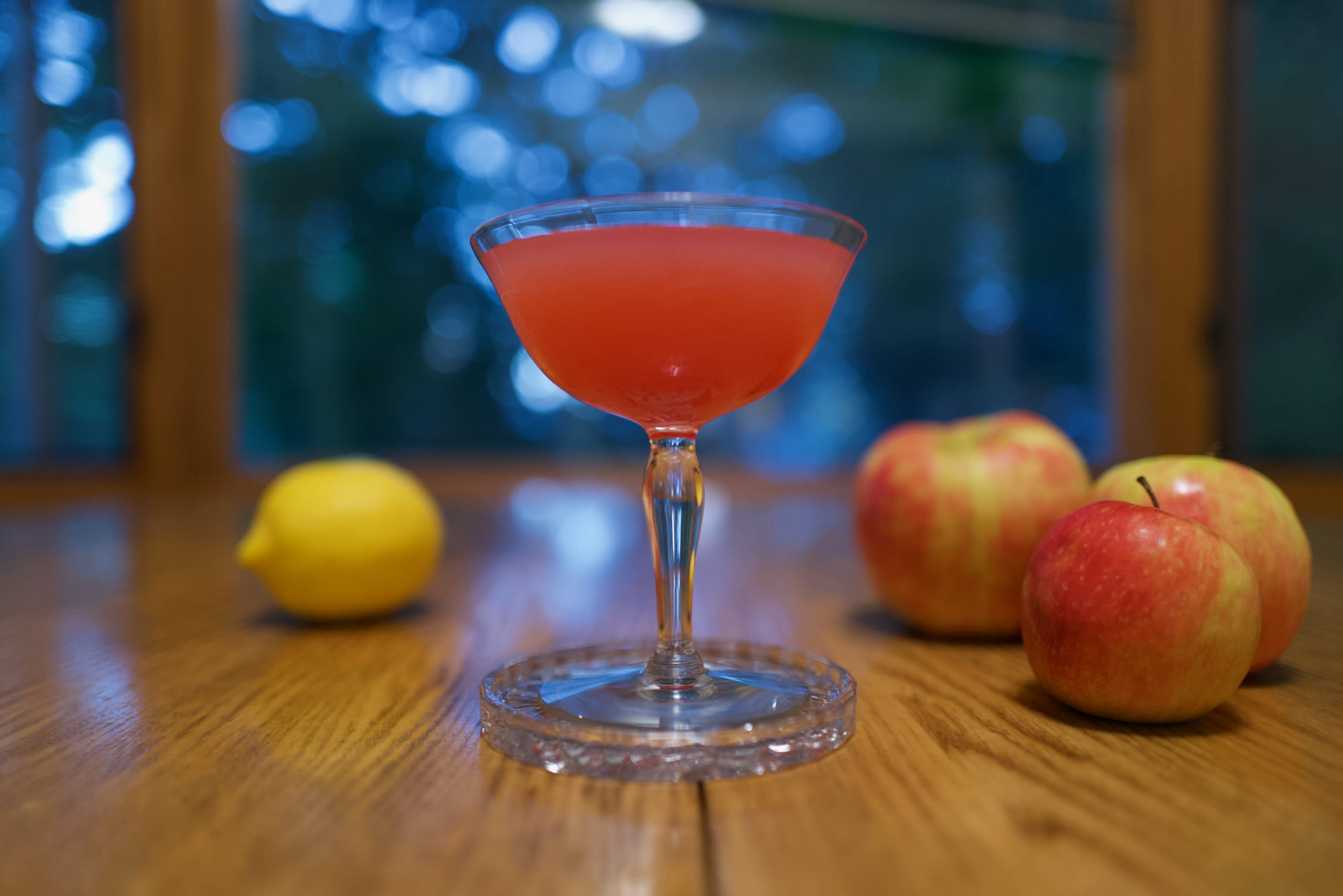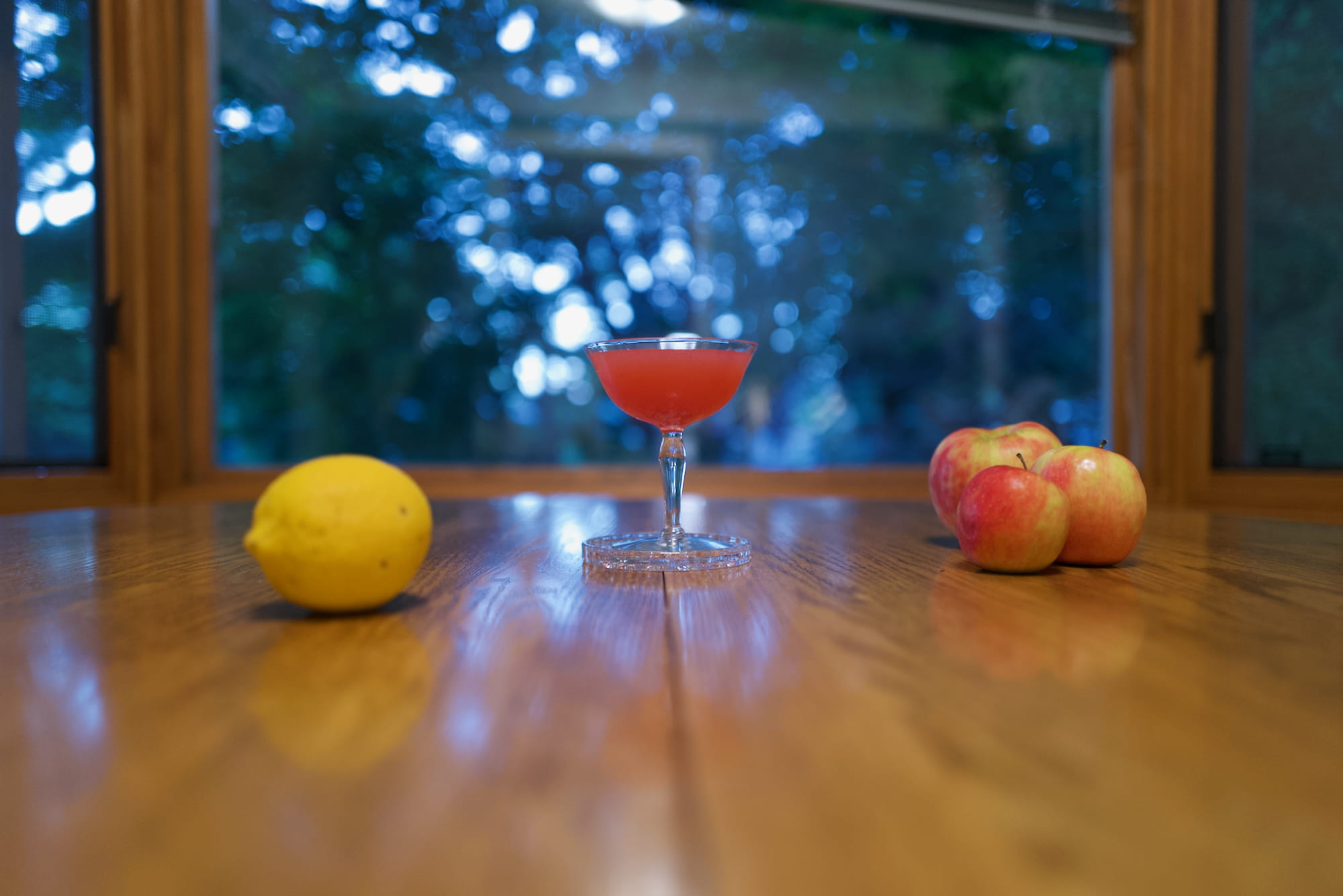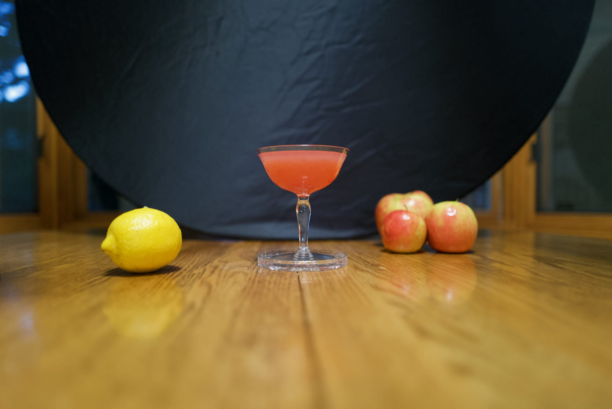 Fortunately, I found a cool glass and nicely colored drink, though I was resigned to the garnish (none) and props (lemon and three apples) being throwaway. I kept the bad props to have some record of depth of field and composition.