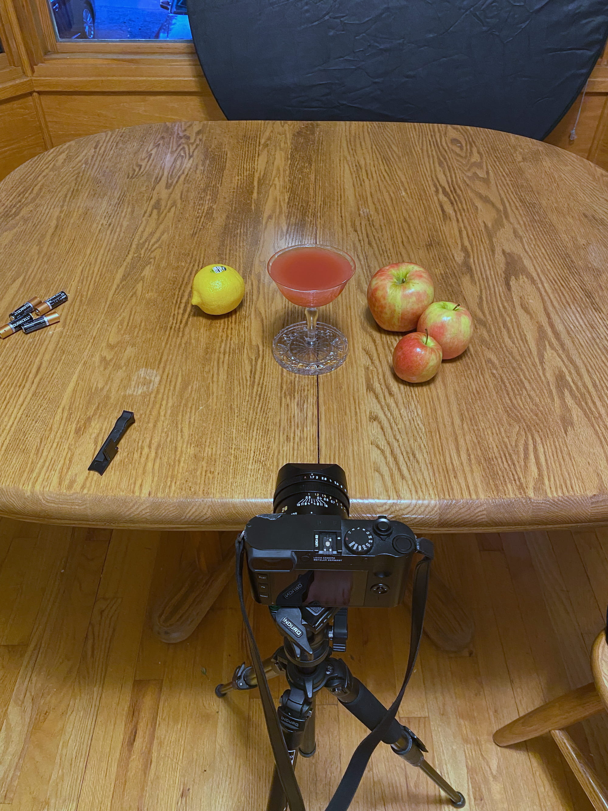 Because the Q2 has a wide focal length (28mm), I knew I wanted to experiment with placing the drink closer or further away. Closer placement makes the drink bigger in the photo, but creates the optical distortion effect where the center bulges out. Further placement mitigates this, though has two side effects: (1) cropping is necessary (fine), (2) depth of field will be widened (also probably fine).04 One additional side effect I didnāt anticipate was (3) close-up placement goes into the macro range. This is fine, though it does narrow the widest aperture from f1.7 (normal) up to f2.8 (macro).05