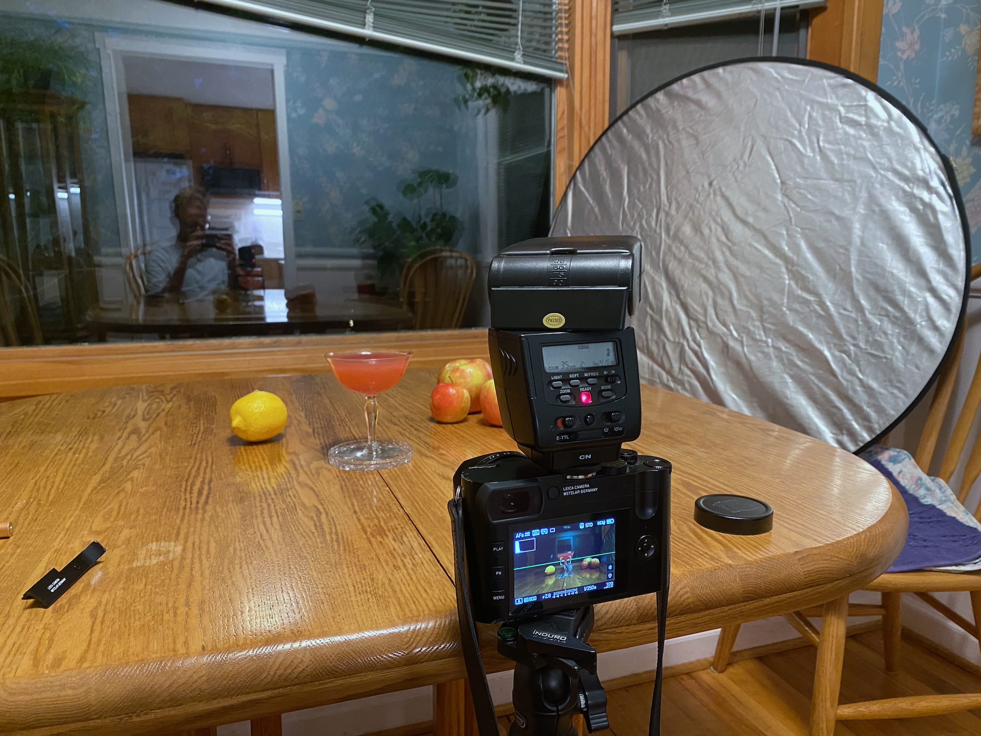 Same setup as previous photo (flash angled to right, reflector, -3ev), but with a narrower flash size: I believe ~ā105mm.ā Overall, this isnāt terrible; the drink itself is lit nicely. Some highlights on the glass and props are unfortunate. But itās the super bright highlight on the table that makes it unusable, even if cropped.[-3ev; f2.8, 1/250s, ISO 800]