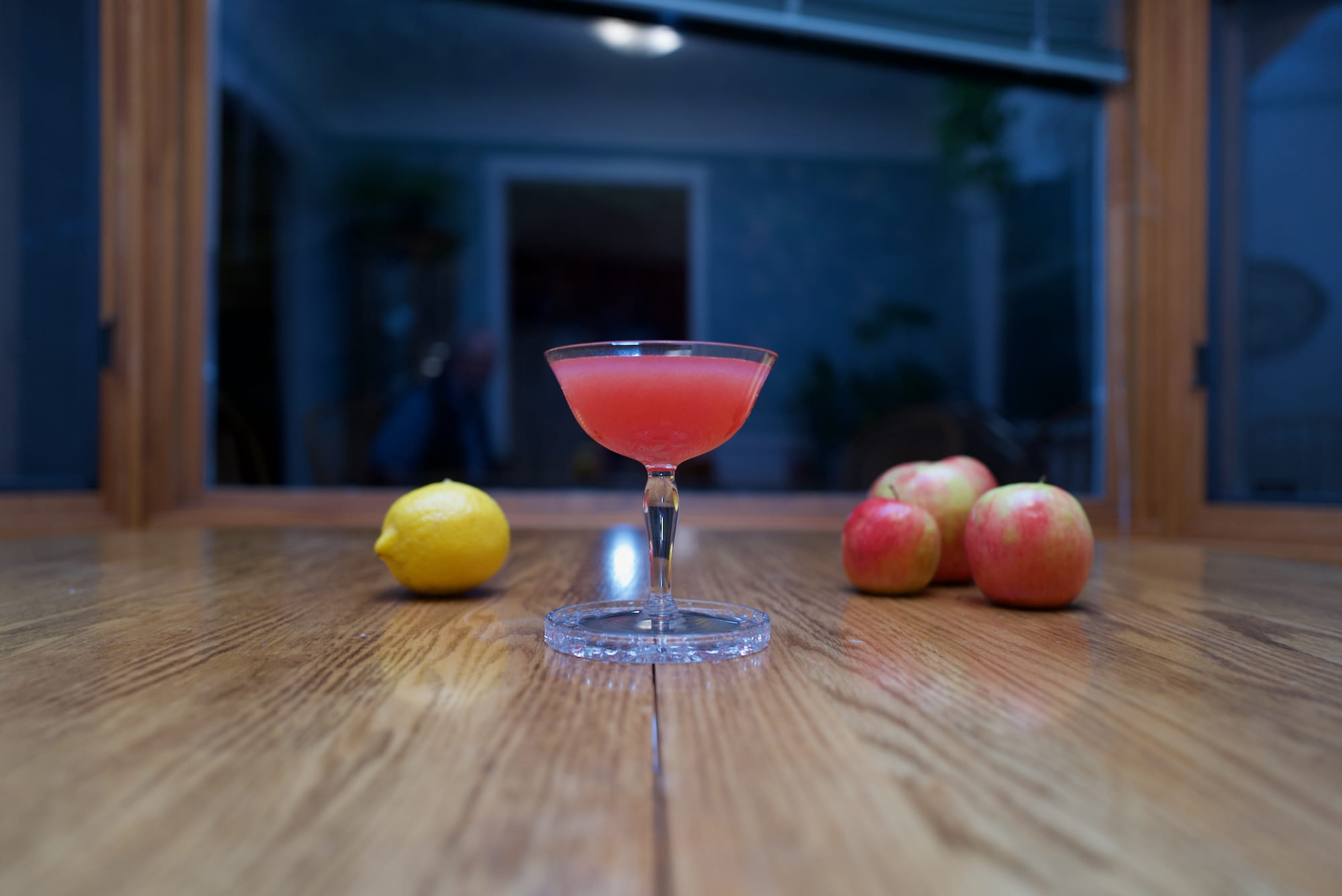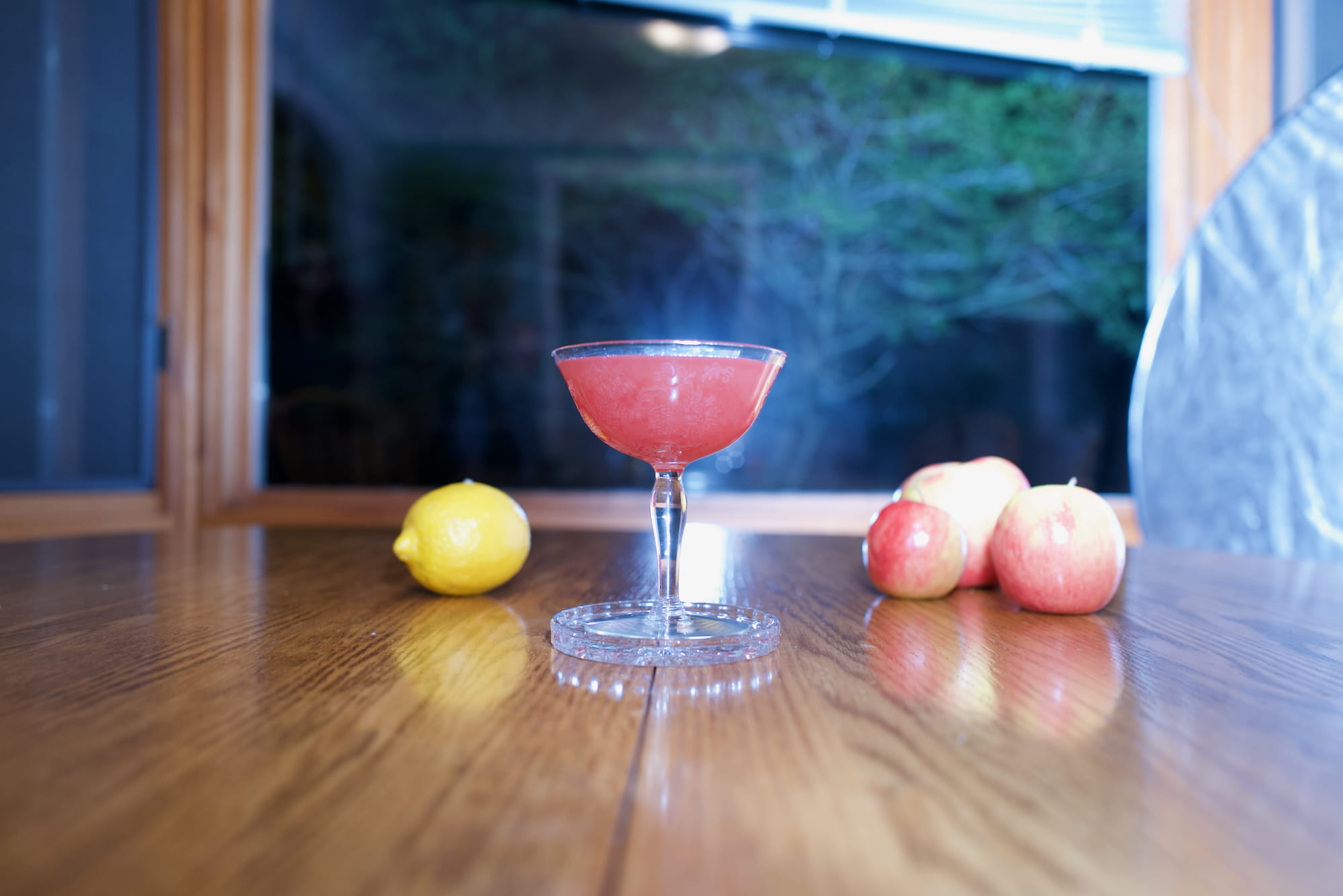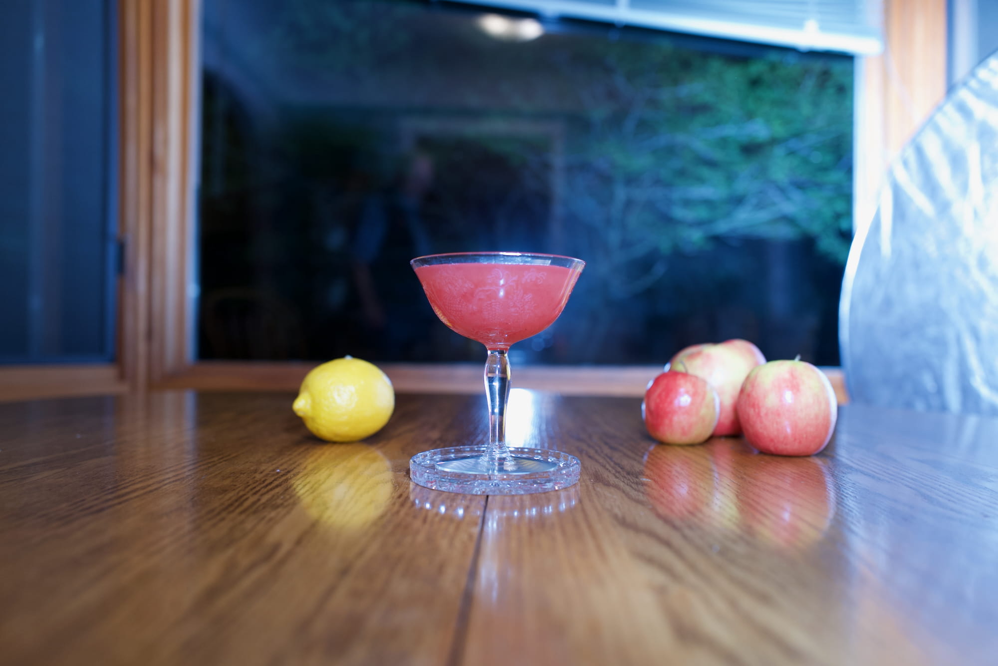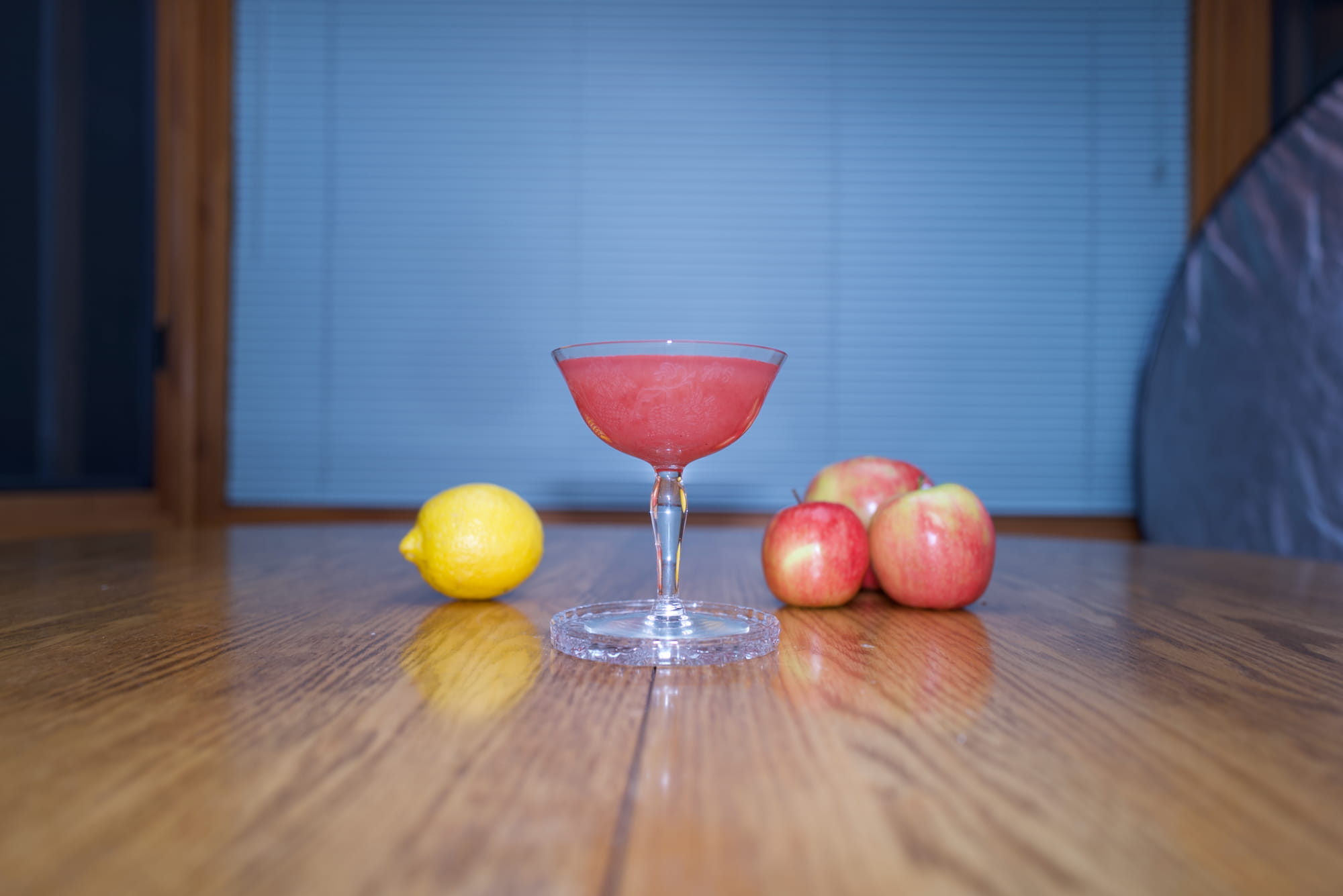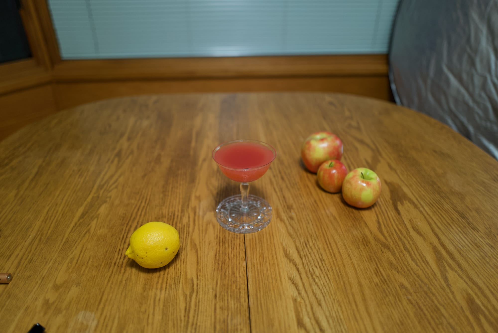 Fortunately, I found a cool glass and nicely colored drink, though I was resigned to the garnish (none) and props (lemon and three apples) being throwaway. I kept the bad props to have some record of depth of field and composition.