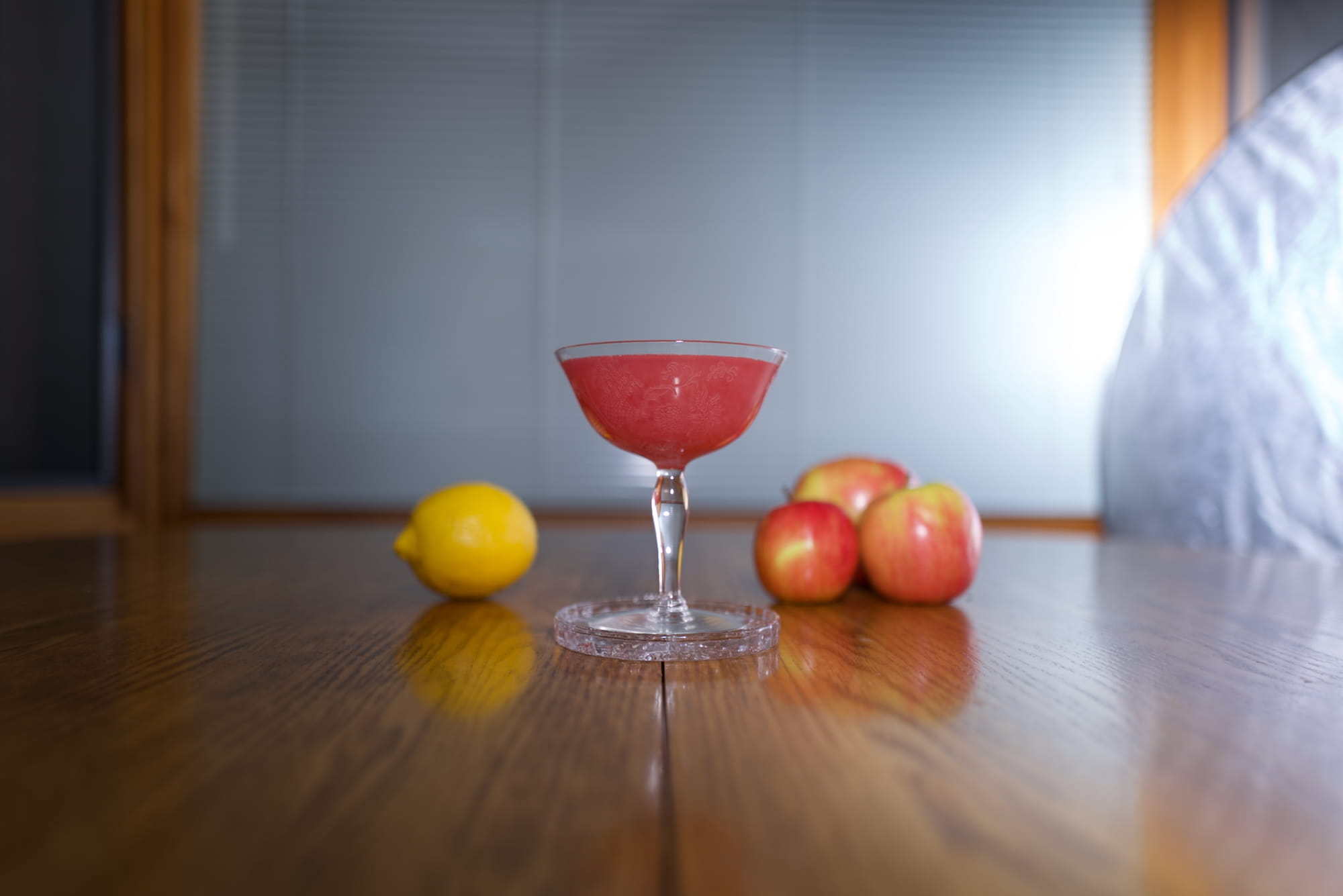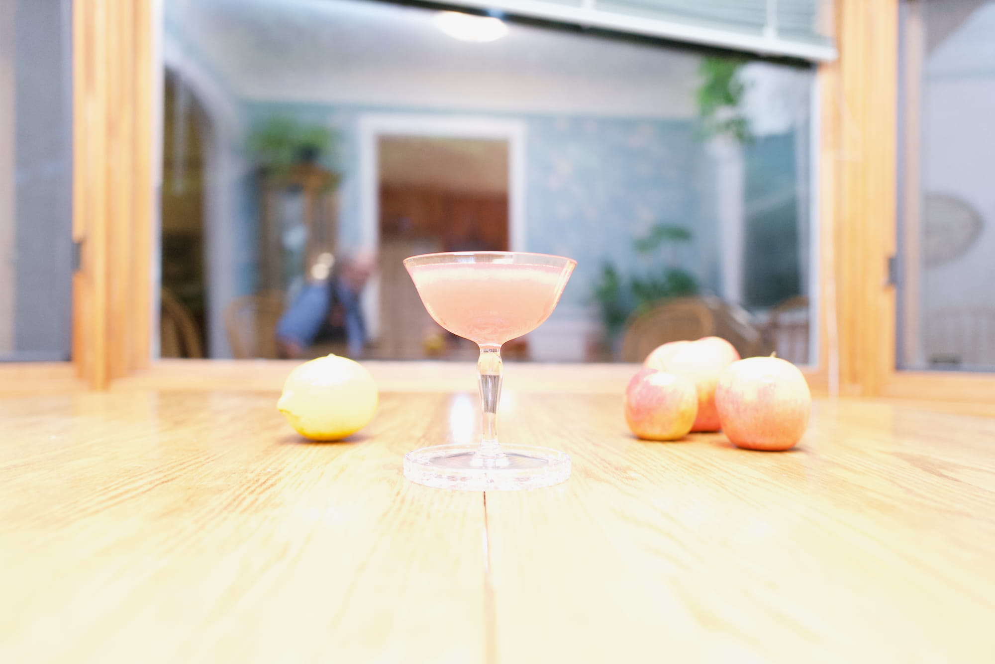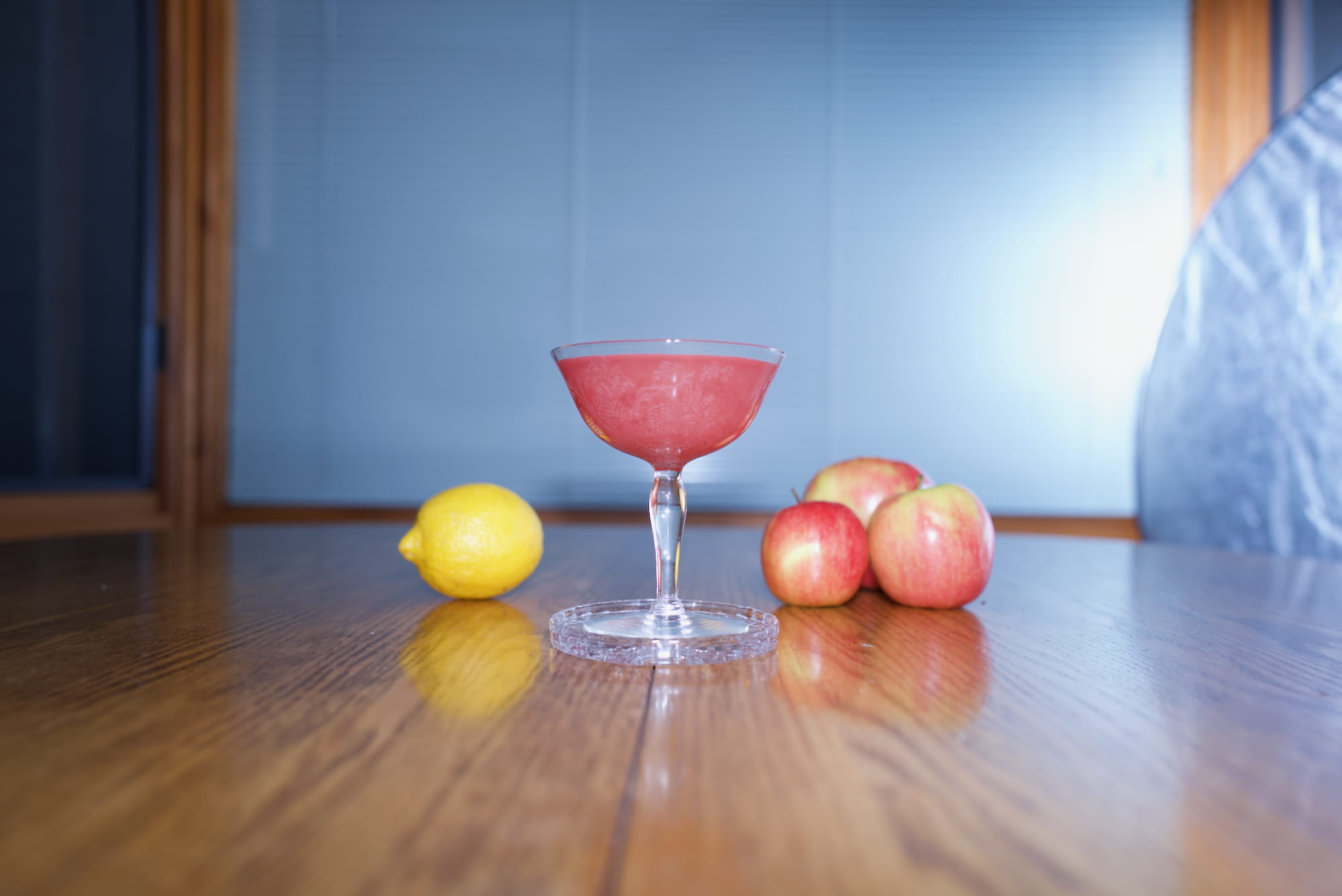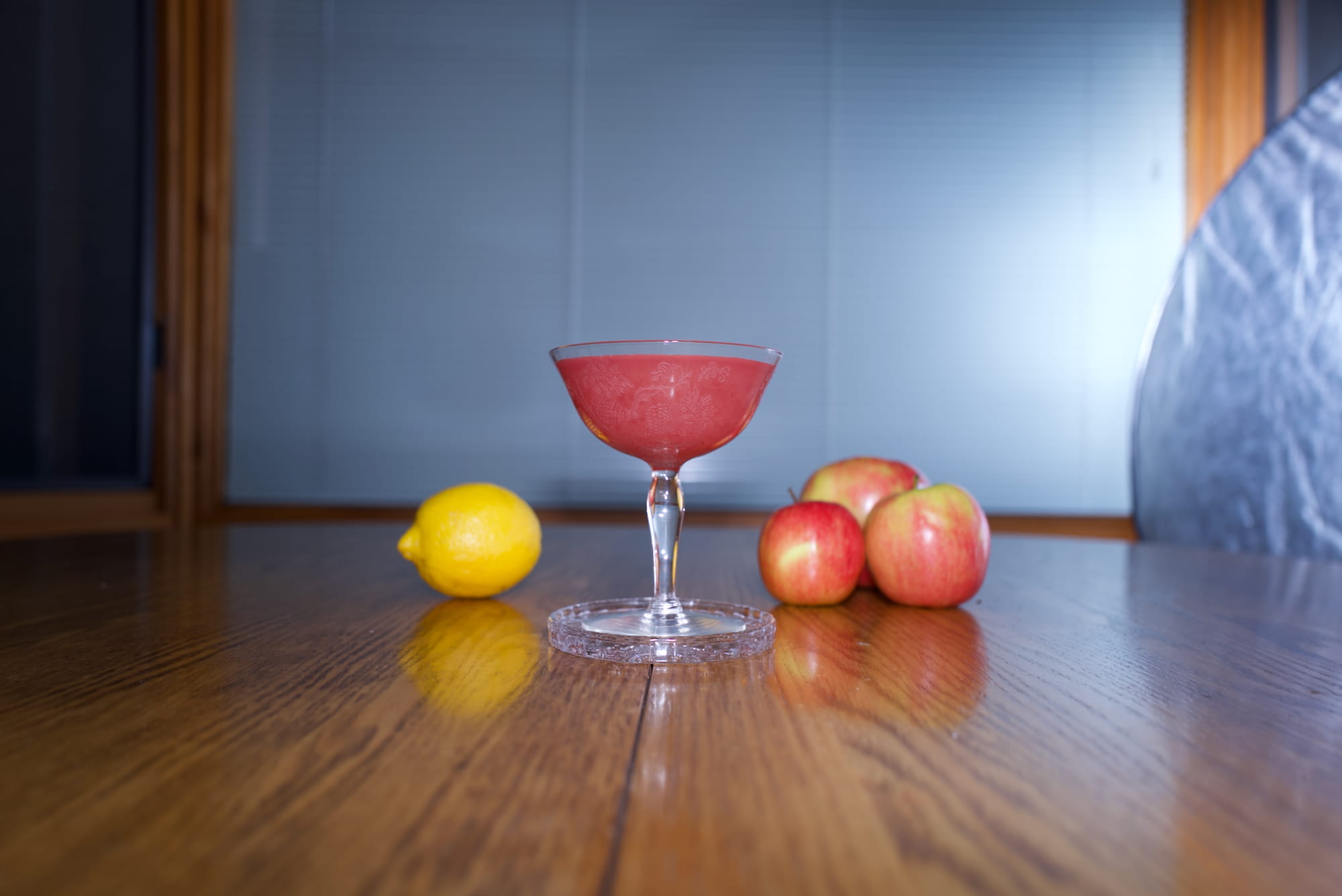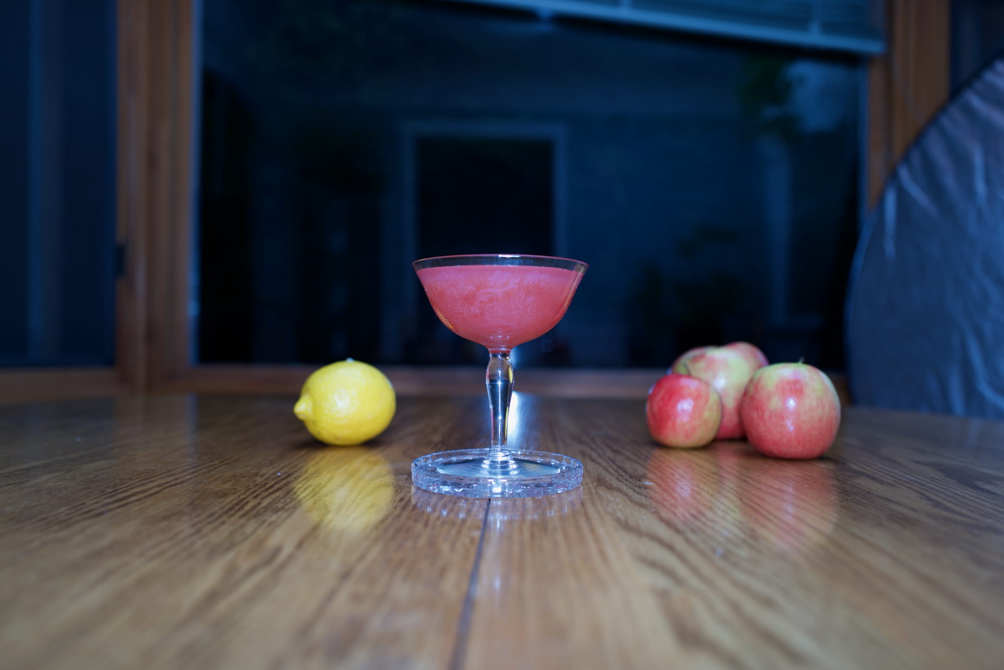 Fortunately, I found a cool glass and nicely colored drink, though I was resigned to the garnish (none) and props (lemon and three apples) being throwaway. I kept the bad props to have some record of depth of field and composition.