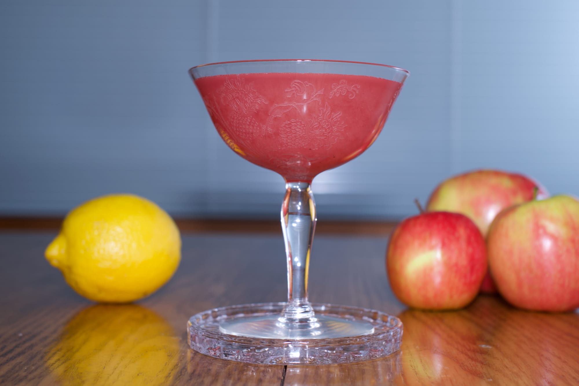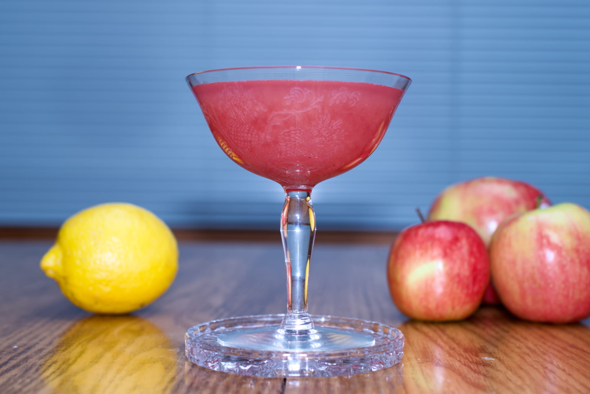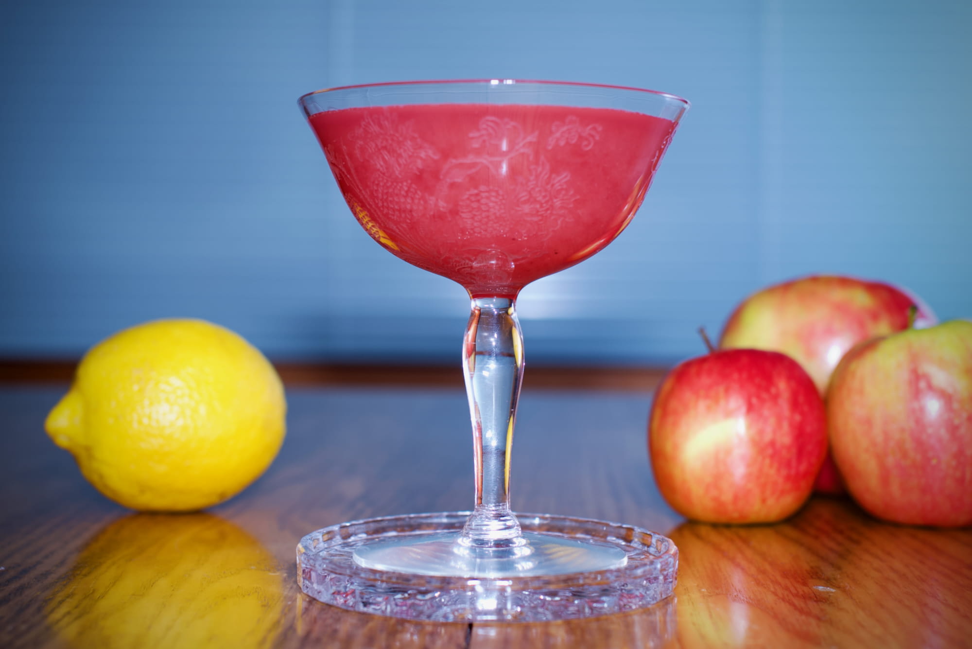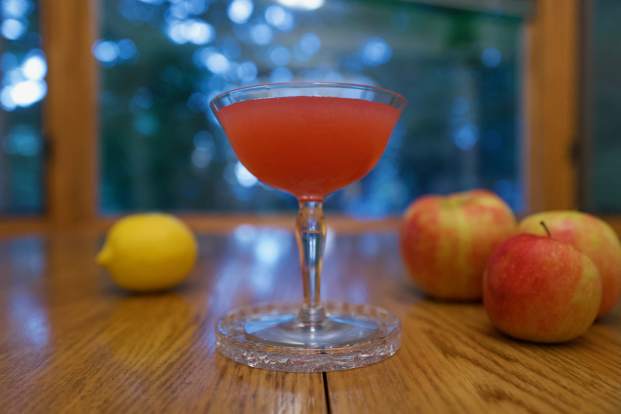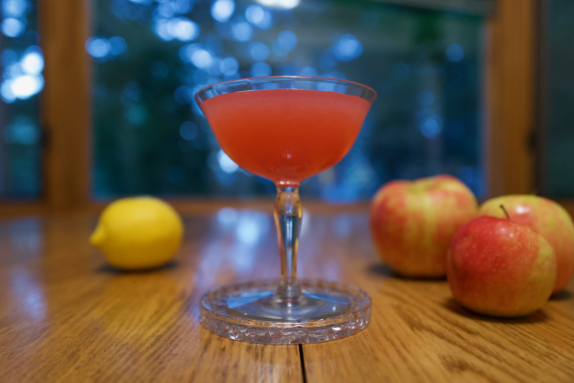 Fortunately, I found a cool glass and nicely colored drink, though I was resigned to the garnish (none) and props (lemon and three apples) being throwaway. I kept the bad props to have some record of depth of field and composition.
