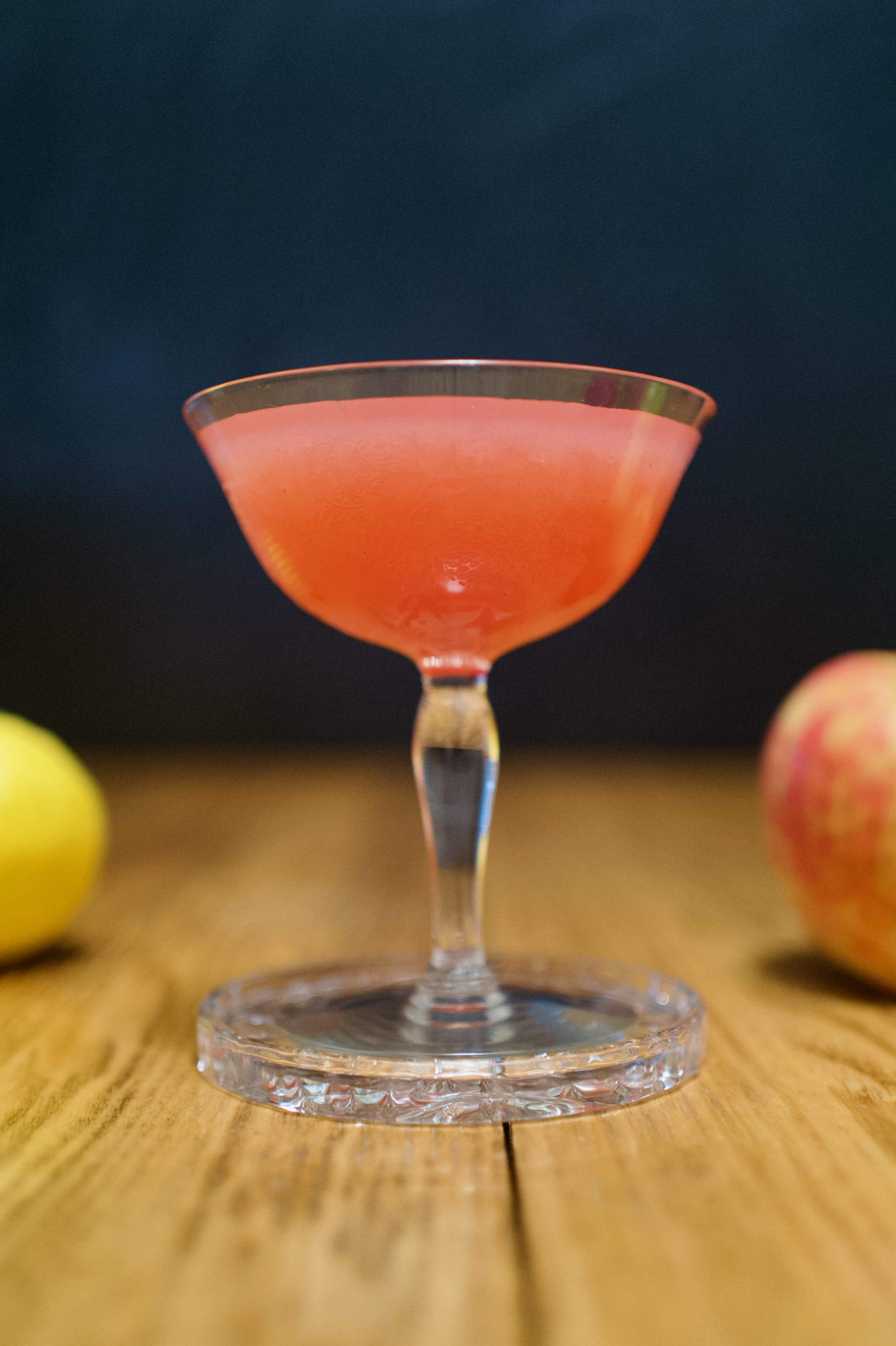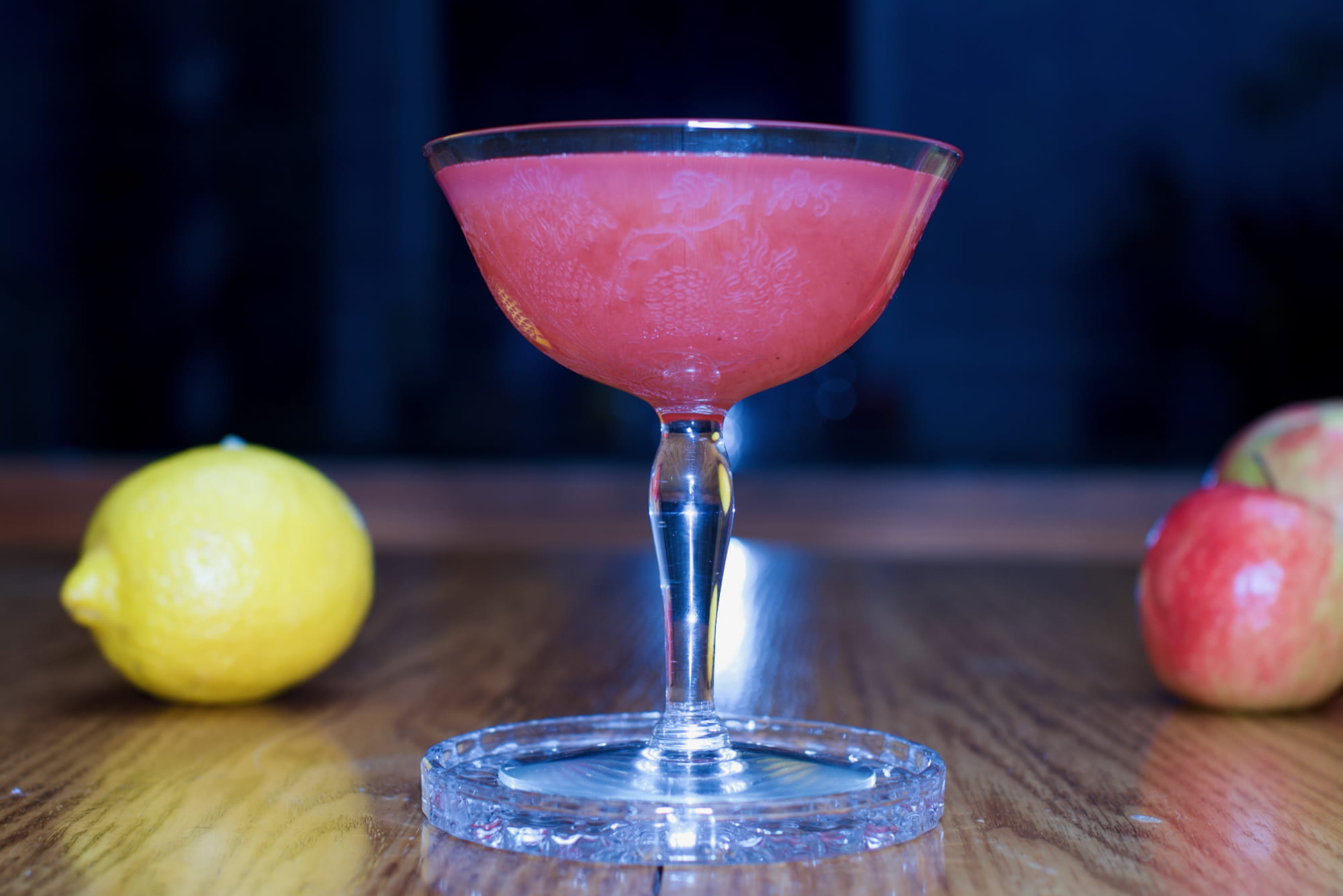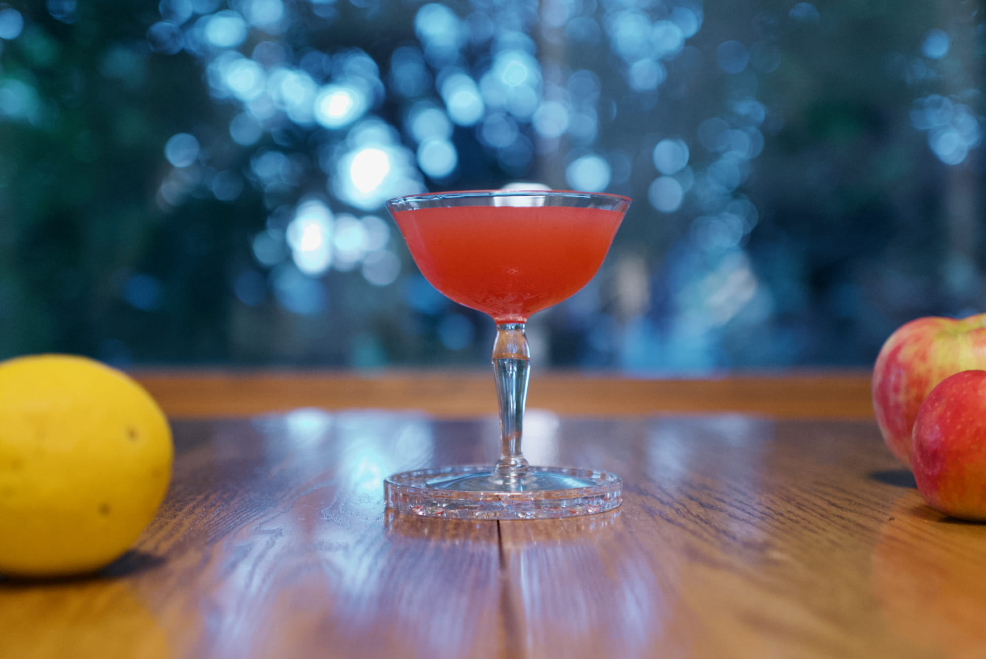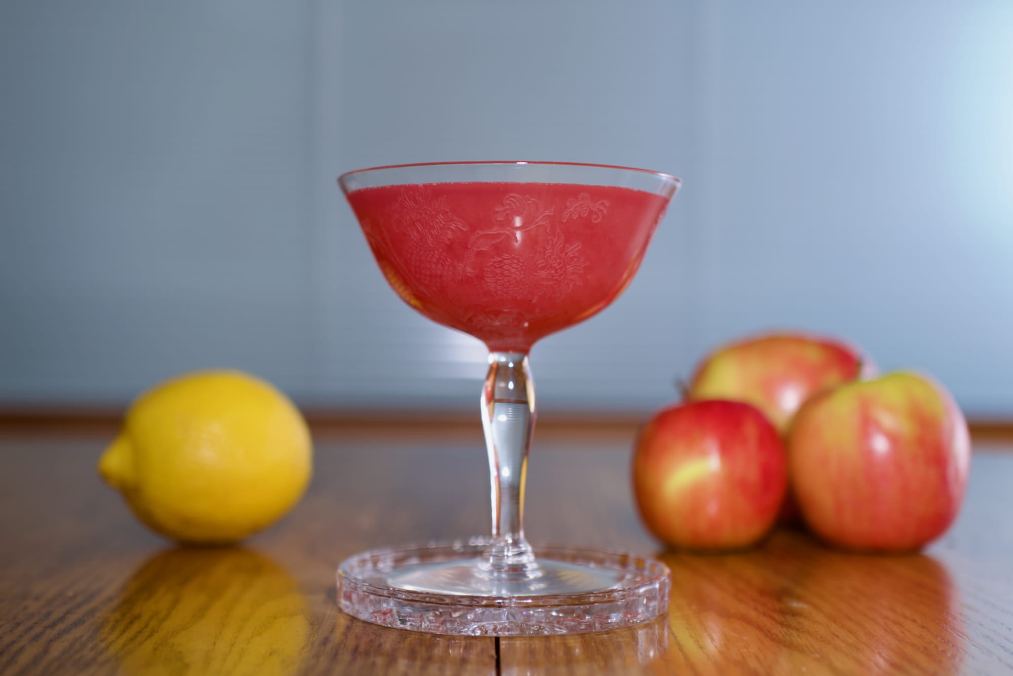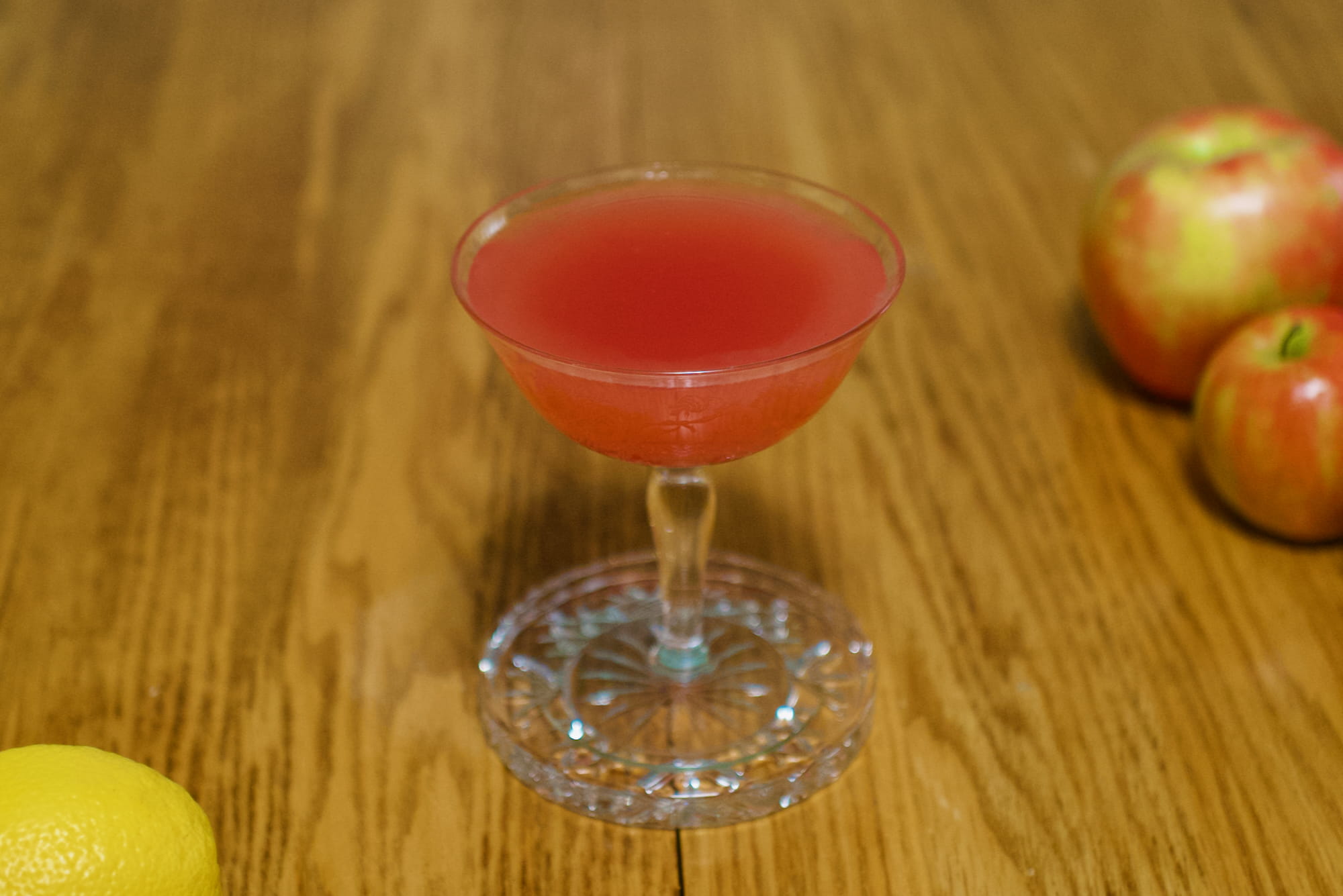 Fortunately, I found a cool glass and nicely colored drink, though I was resigned to the garnish (none) and props (lemon and three apples) being throwaway. I kept the bad props to have some record of depth of field and composition.