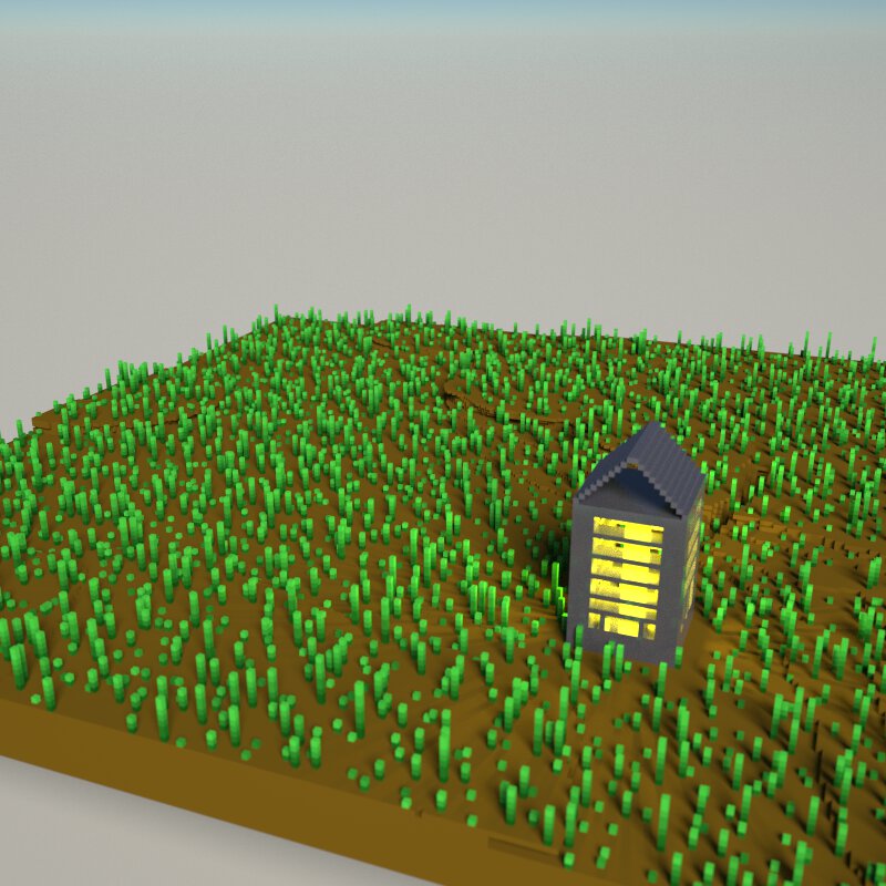 Challenge now using grass shader: it wants to place on flat surface. Workaround by placing in air, then repeatedly running “drop” shader from lowest to highest color.