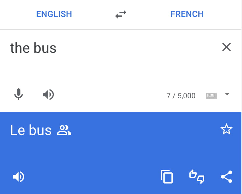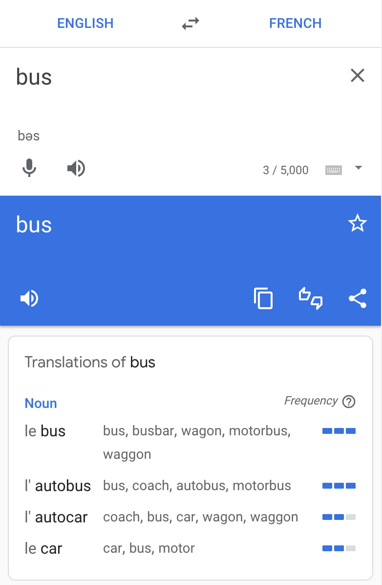 Now, Google Translate does have a great feature where you can see alternate translations. However, it doesn’t always show them to you. You seem to need to come up with specific incantations to see them. If you provide “the bus”—which you might think to do for languages like Spanish or French that love having words like “the” before nouns—it won’t give you any other options. But, if you just write “bus,” then below, you’ll see other options: