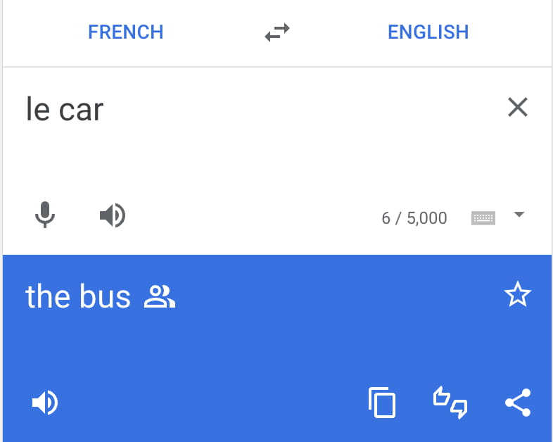 But they’re right. Actually using NLP is all about context. Once you try using one of these things on the ground, you see how much intent matters. What are you trying to achieve? Are you trying to pay your tab at a restaurant, or are you asking about a parking ticket? Are you trying to ask when the bus comes, or are you just curious about when a French person would use le bus vs le car?"