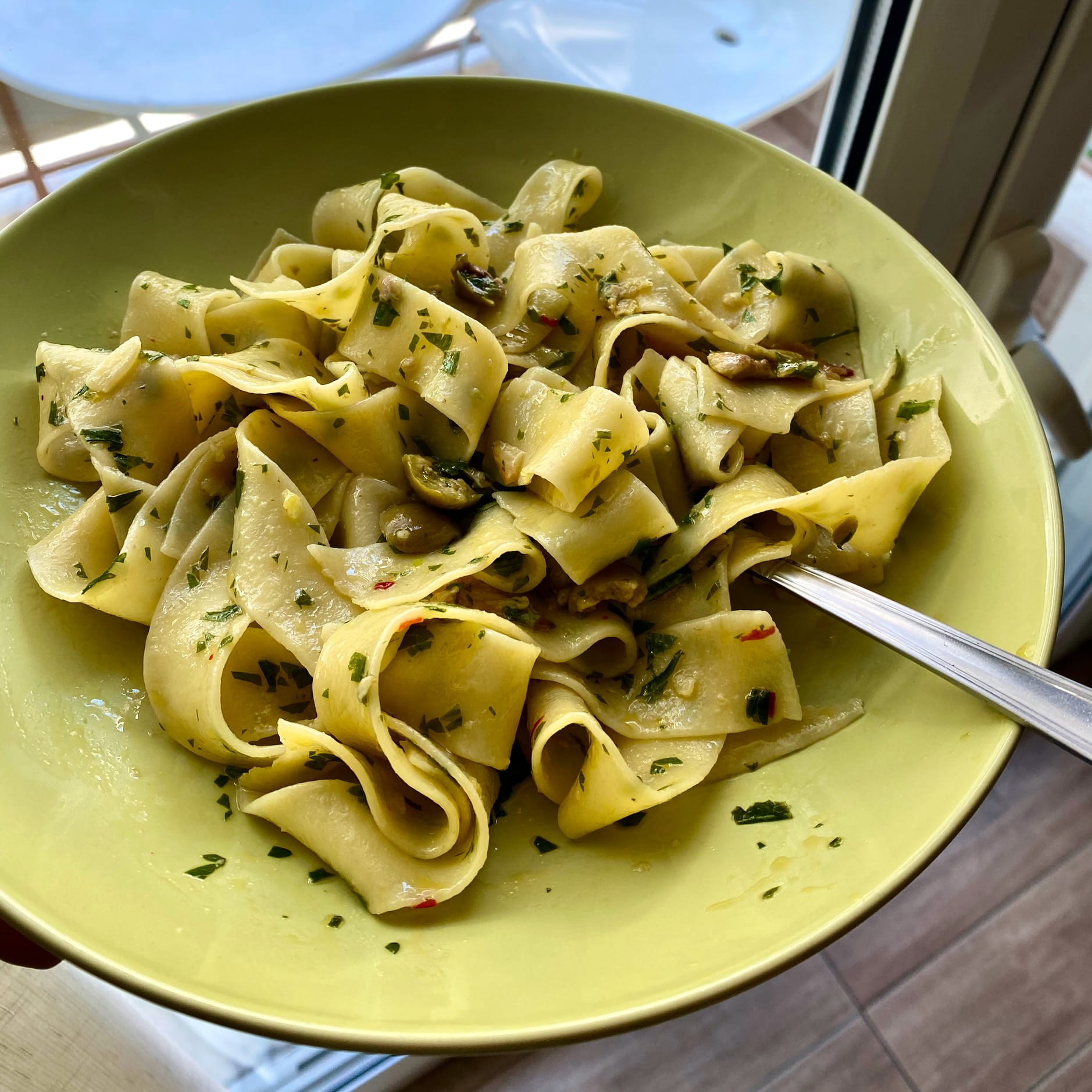 Our optimistic plans of cooking local food are nearly always dashed by spartan AirBnb kitchens equipped basically only for pasta making. We made do by throwing in a bunch of olives.