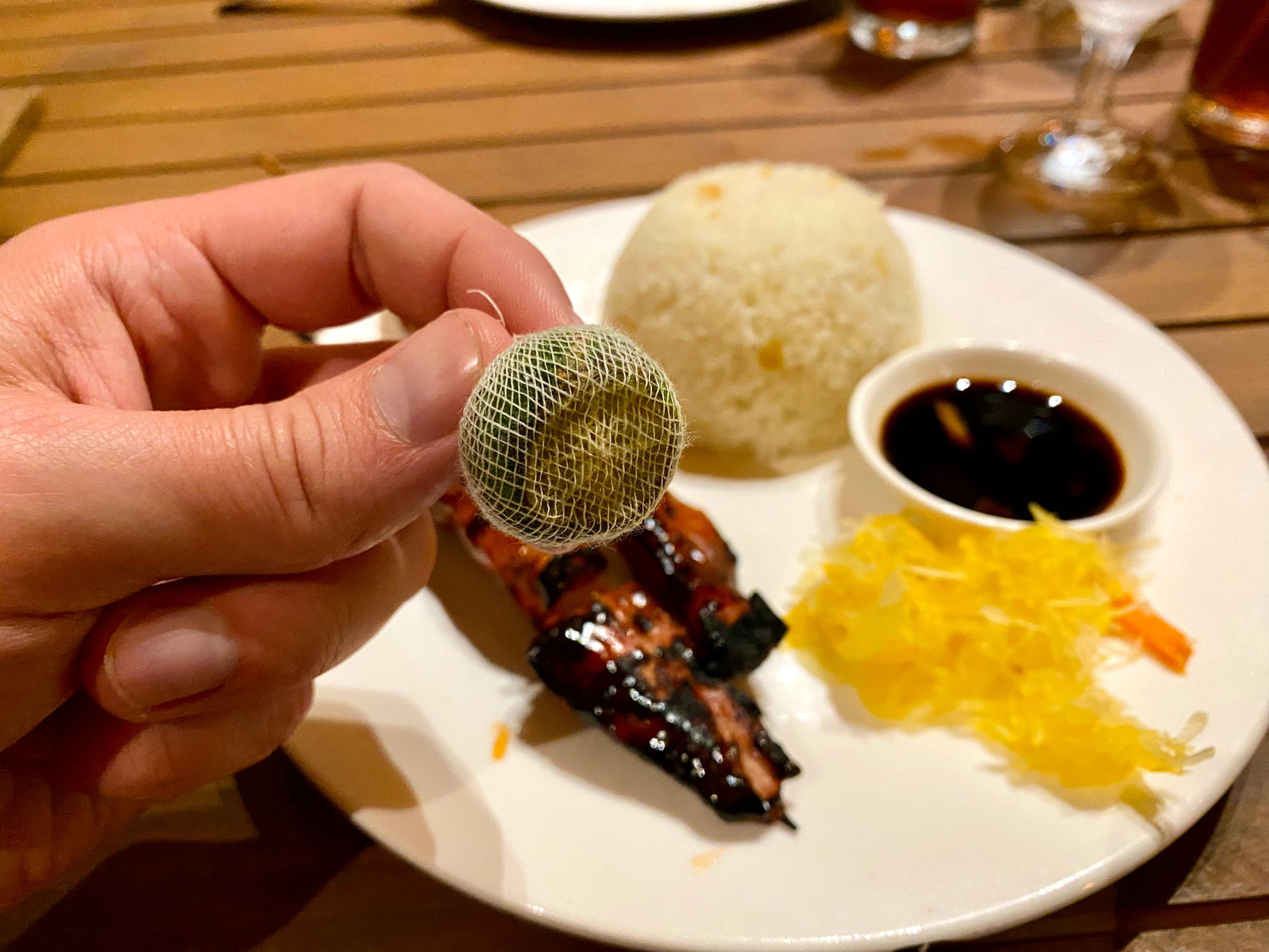 Way better was some local grilled meat. The part I really want to point out, though, was this adorable little citrus net to hold in errant seeds.