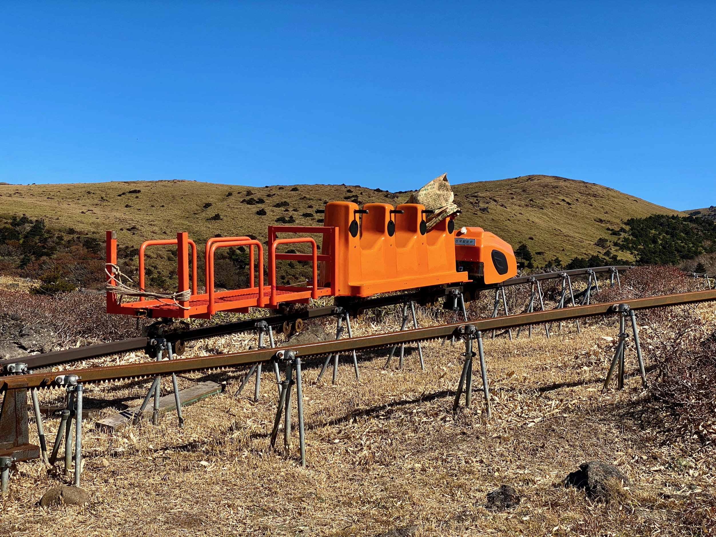 On the hike down, I kept noticing this strange rail-looking thing running alongside the plank trail. Finally, the mystery solved itself when we came across a tiny train mounted on it. Itās a tiny person / gear transport! We passed some workers doing trailside pruning on the way down, who I think had used it.12 So cute. So delightful.