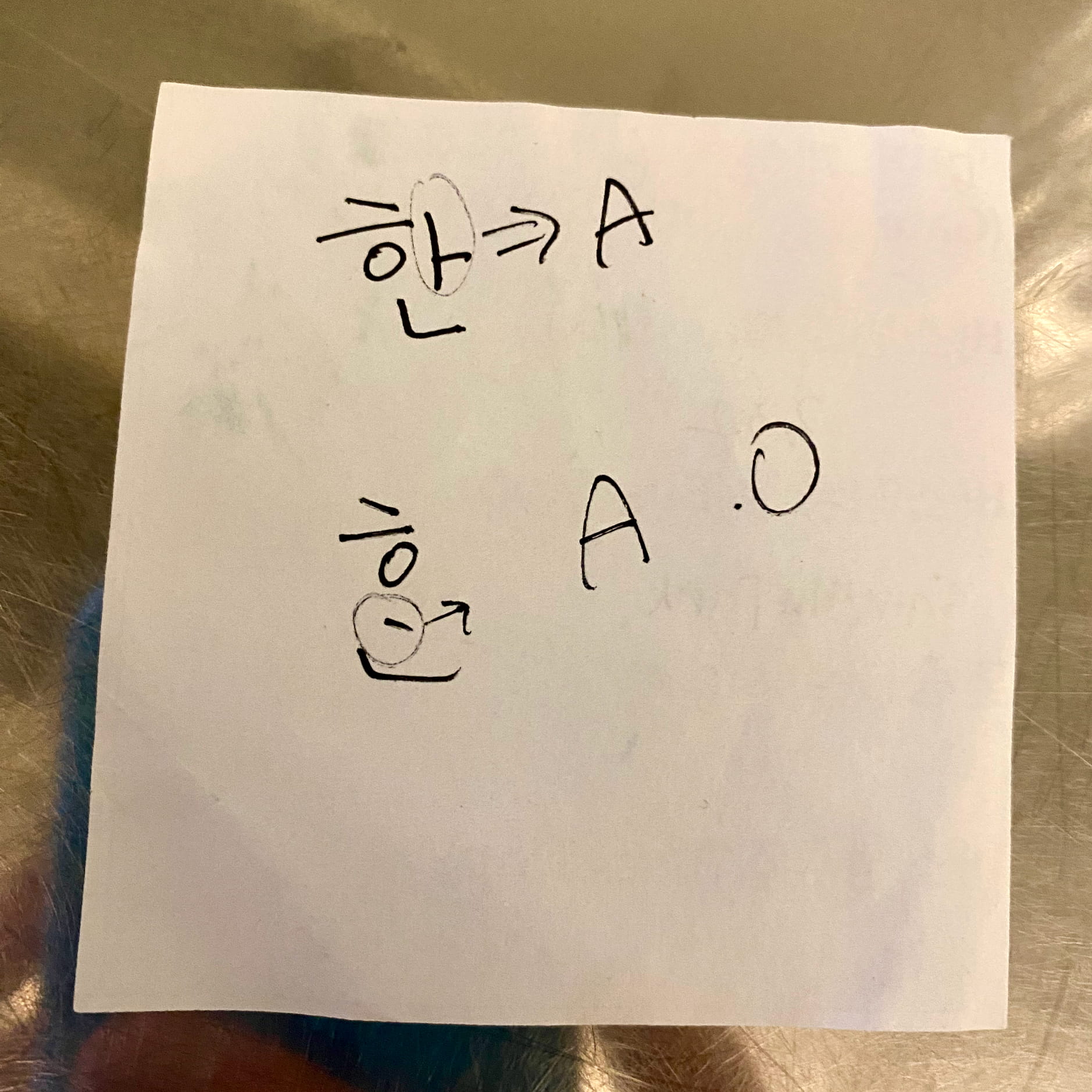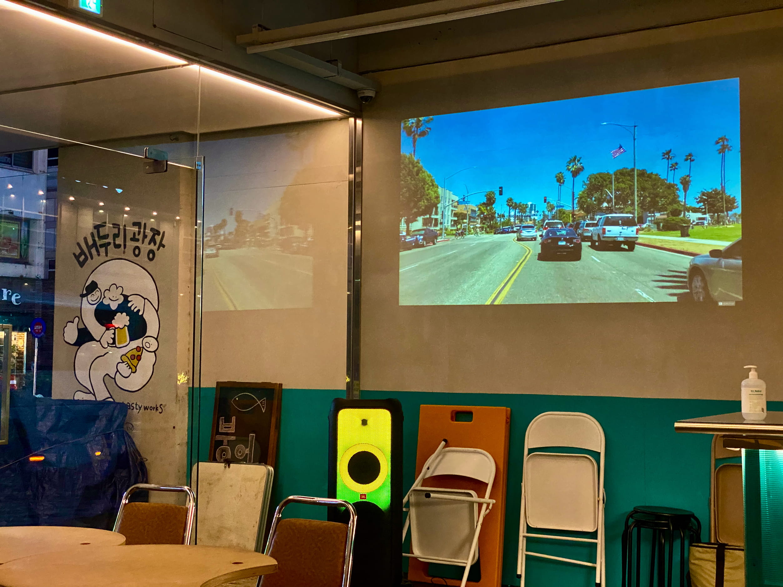 Some good vibe touches, like endless projected video of just driving around California. In the last photo theyāre trying to explain to me how the regional dialect of Jeju differs from what youād encounter in, e.g., Seoul. Iām pretty sure this is illustrating parts of letters that you can see on street signs in Jeju that donāt appear in other dialects of Korean.