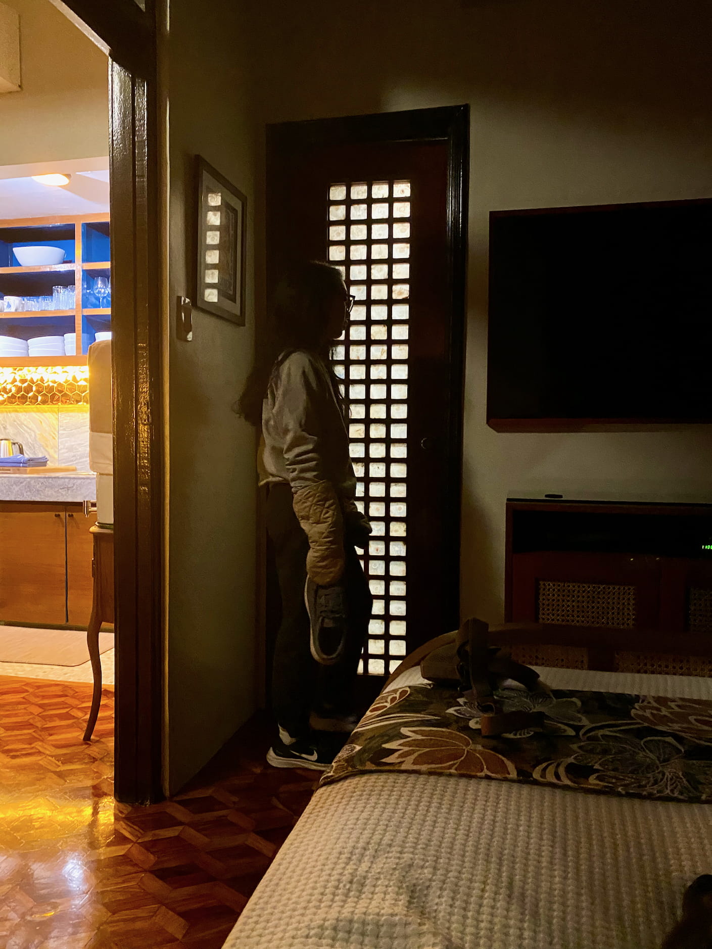 When we get to our complex, the building entrance has an iron gate with a padlock on it. We get the attention of the guard on duty who lets us in. It turns out that this iron gate isn’t just a nighttime thing, but it’s locked at all times. You need the guard’s help if you want to enter, or if you want to leave.