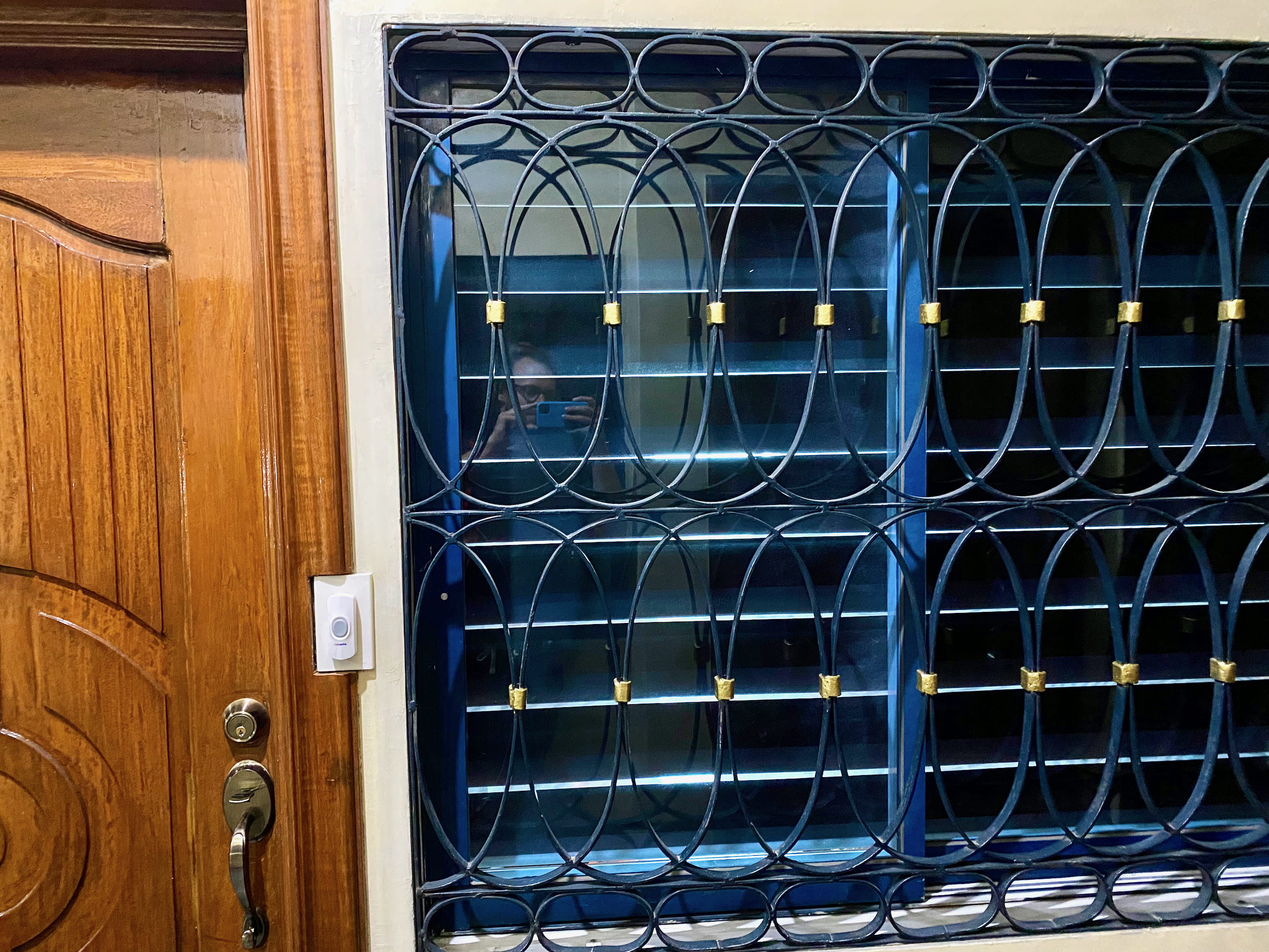 Even in the iron gate’d building complex, our individual unit also has iron bars on the windows facing the hallway.