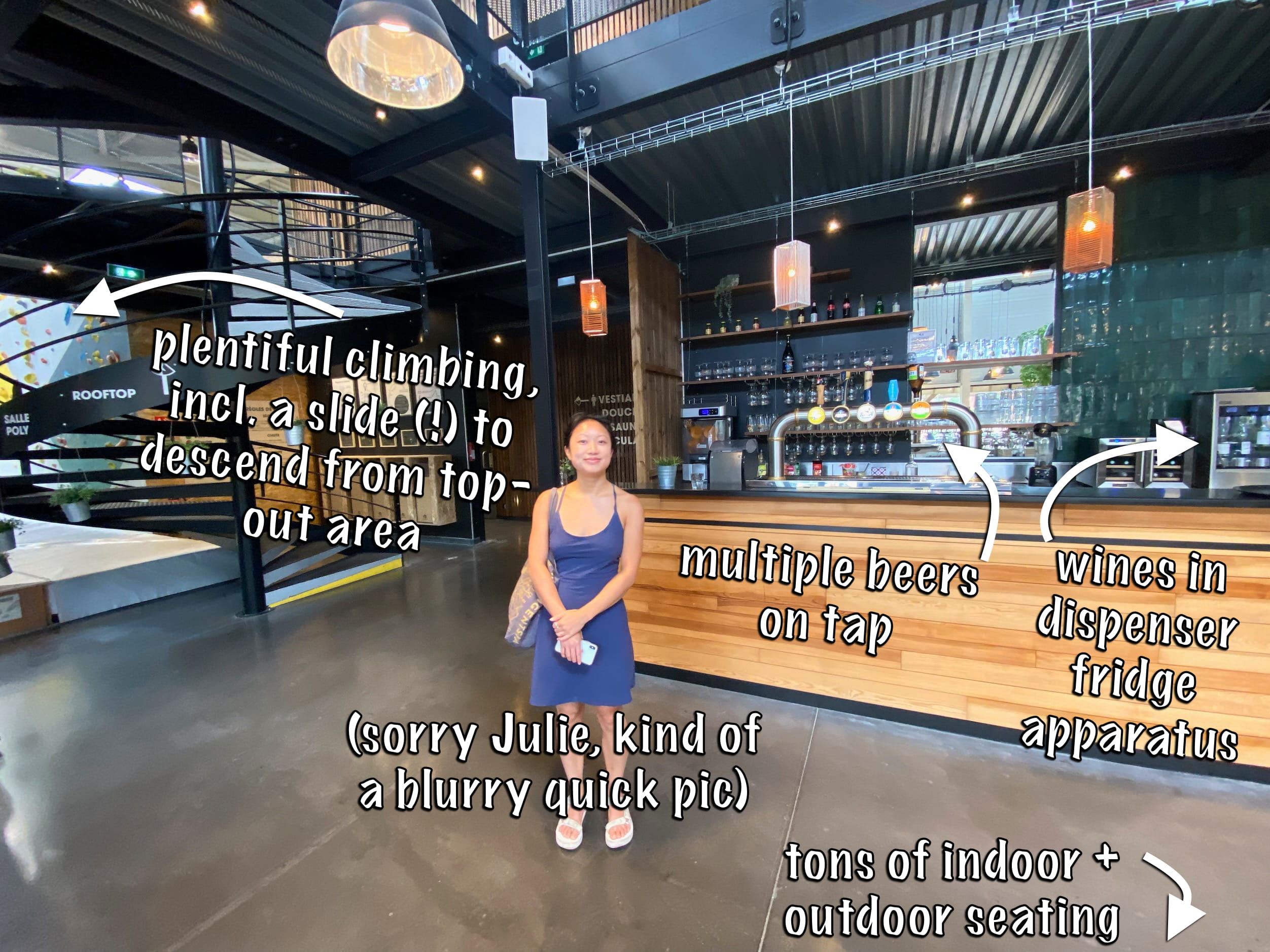 Top: Left: Lovely indoor rock climbing. Seattle Bouldering Project (our local gym) had a marvelous big cafe inside that I frequented for both morning caffeination and post-climb beer, but it had been closed from the start of Covid through when we left Seattle in March, 2022. I missed it a lot. Bottom: Right: Portrait of the author.