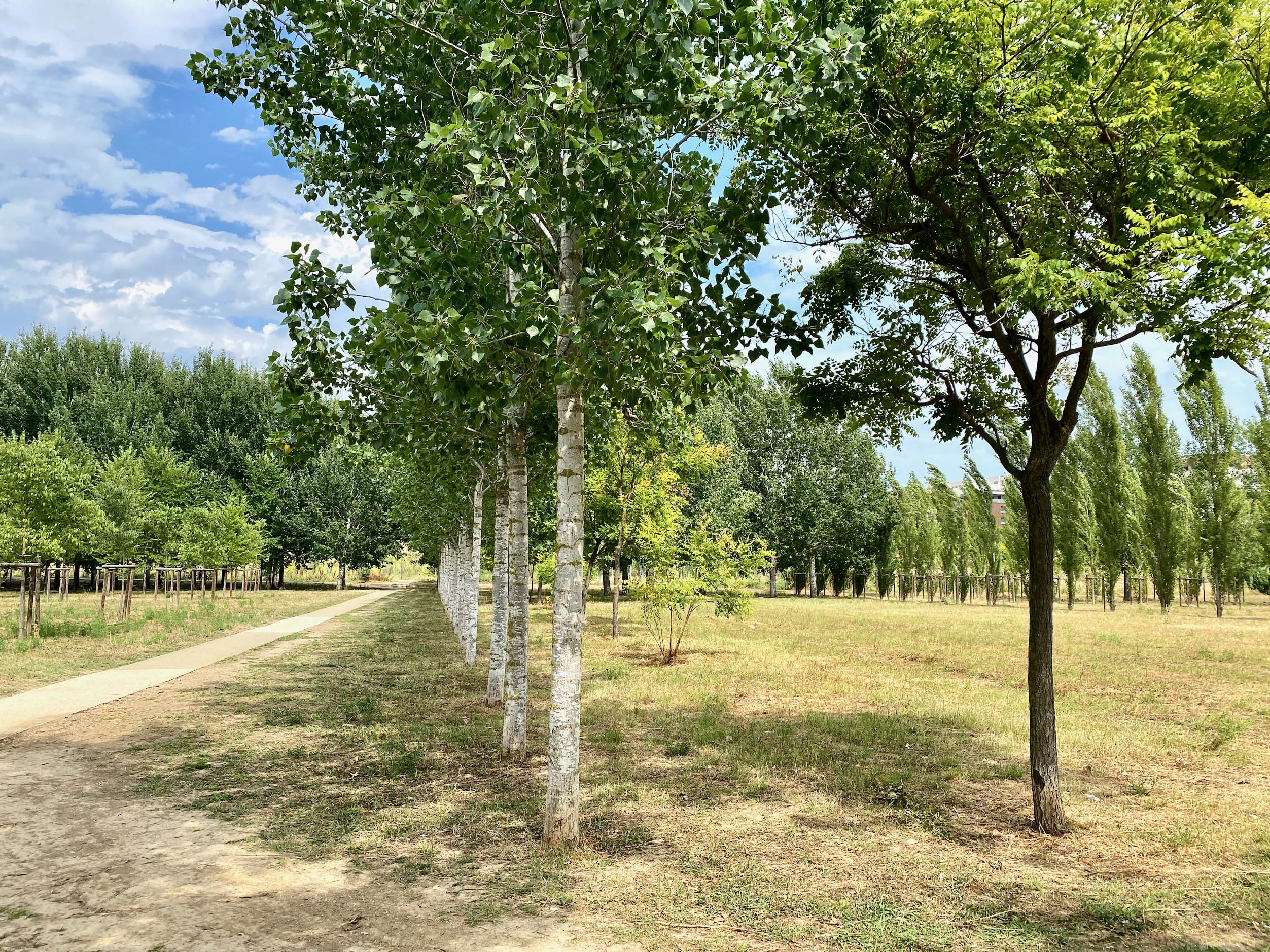 It’s a bit hard to tell just from this photo alone, but the whole park is just fields of (patchy, dying) grass with trees planted in an exact grid. The rows of trees thing made the parks feel alien. We never saw anyone hanging out in them.