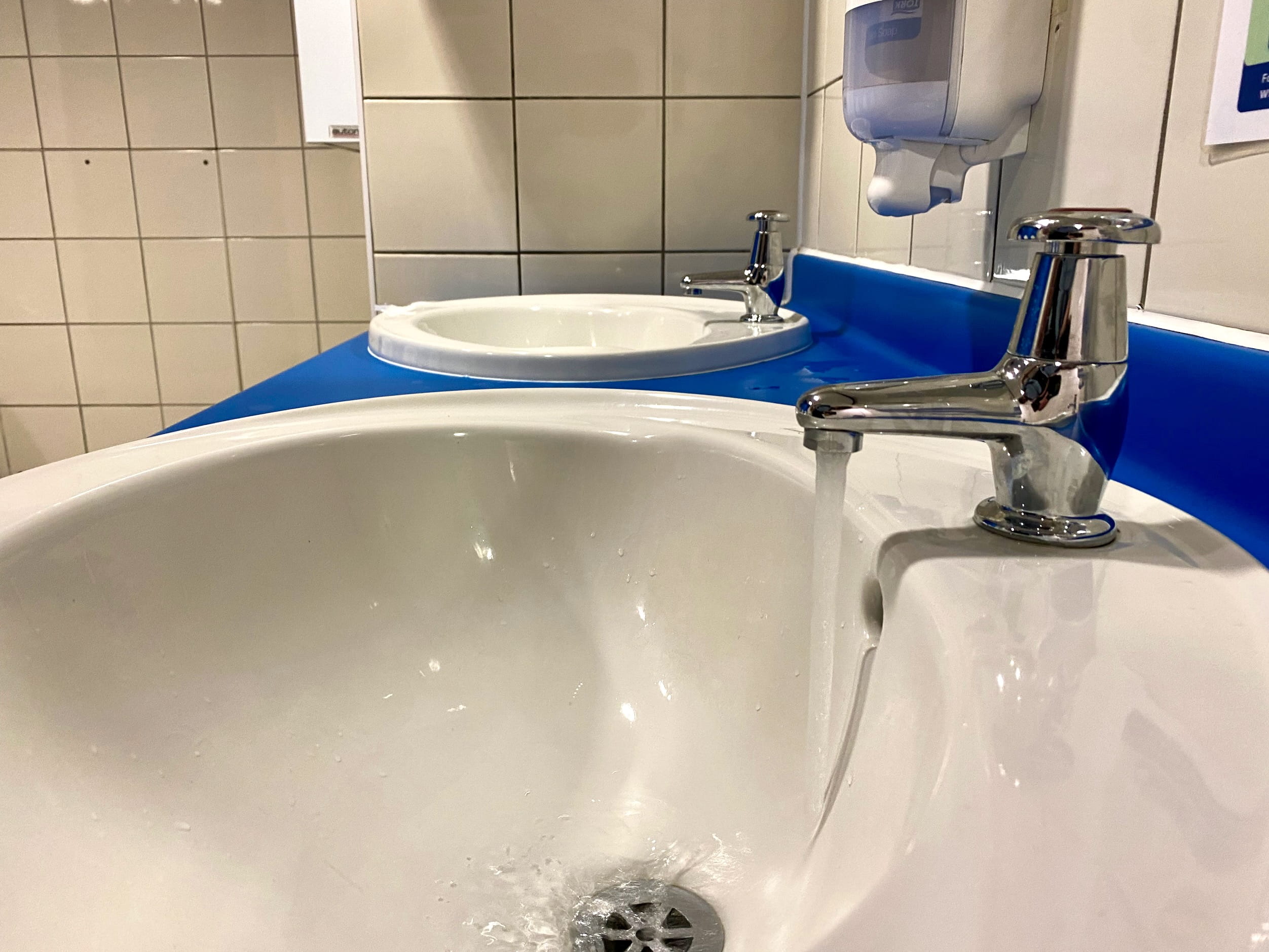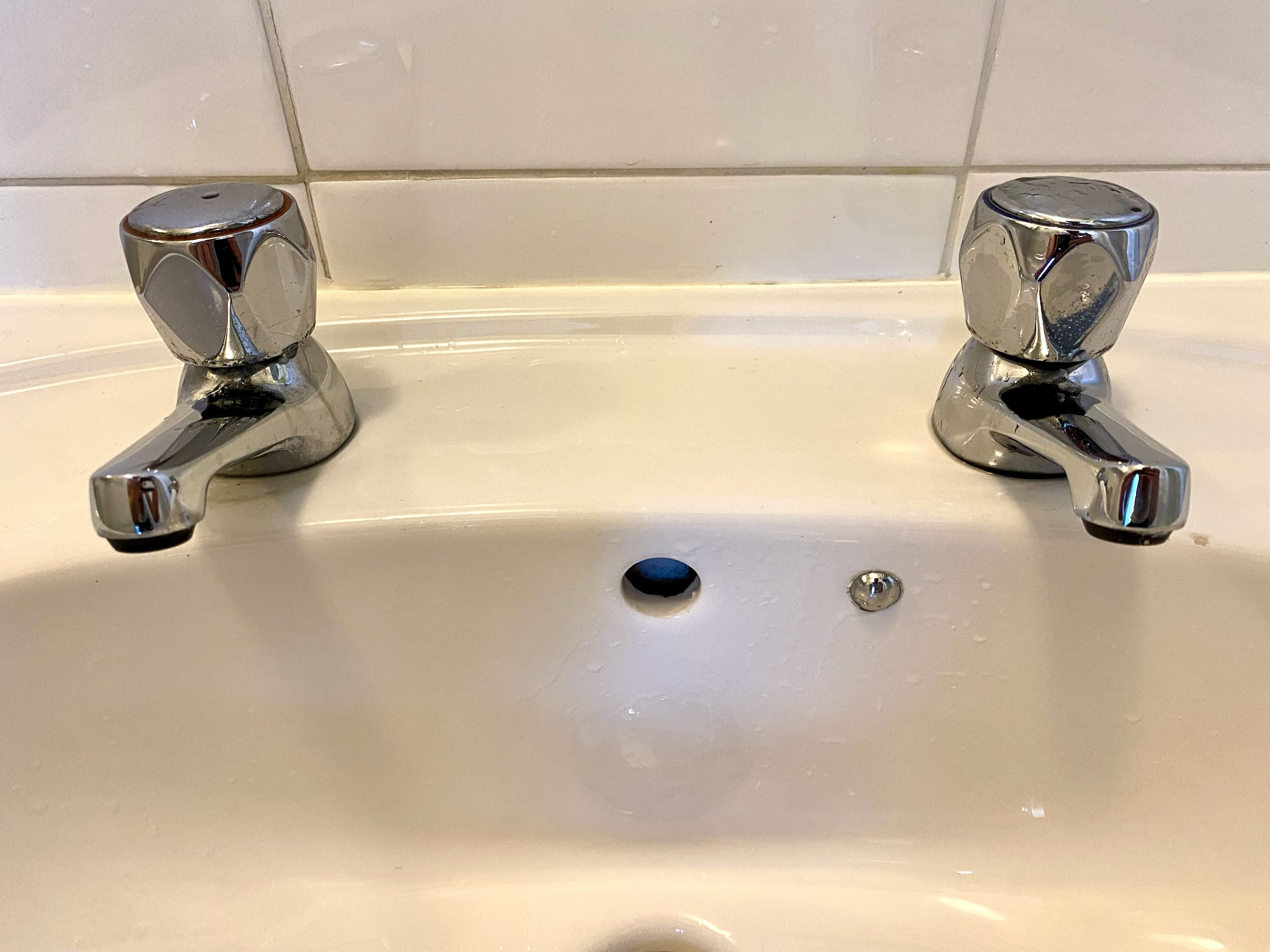 Out of the left comes skin demolishing scalding water, and out of the right a frigid stream. Thereās no way to mix to achieve warm water except, I donāt know, plugging the drain and filing up the sink? In practice you just use cold water all the time.