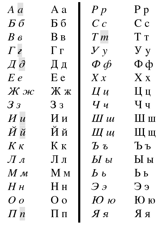 Cyrillic letters & italic variants.