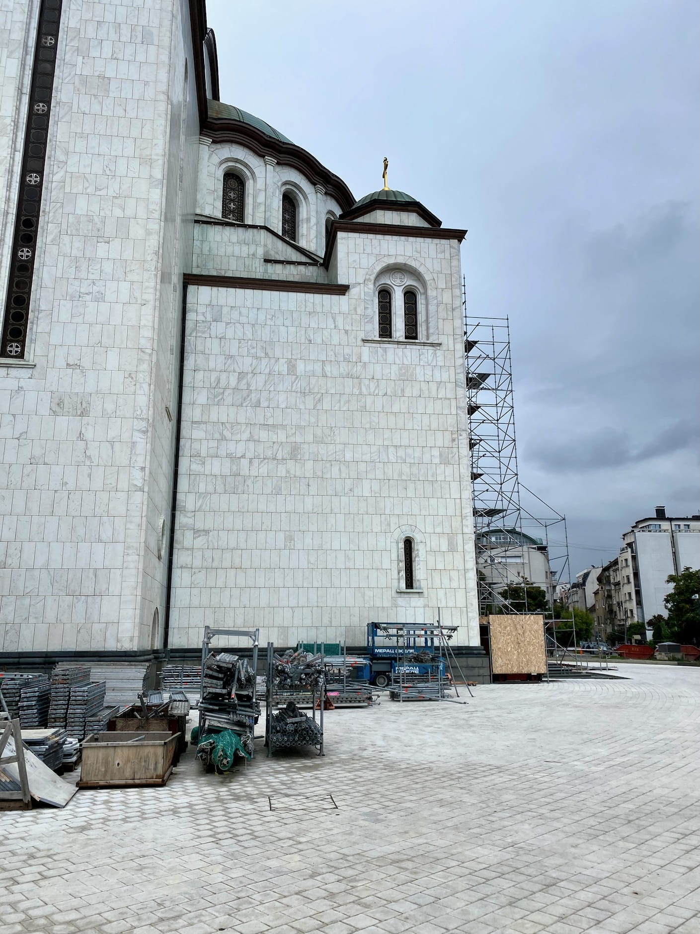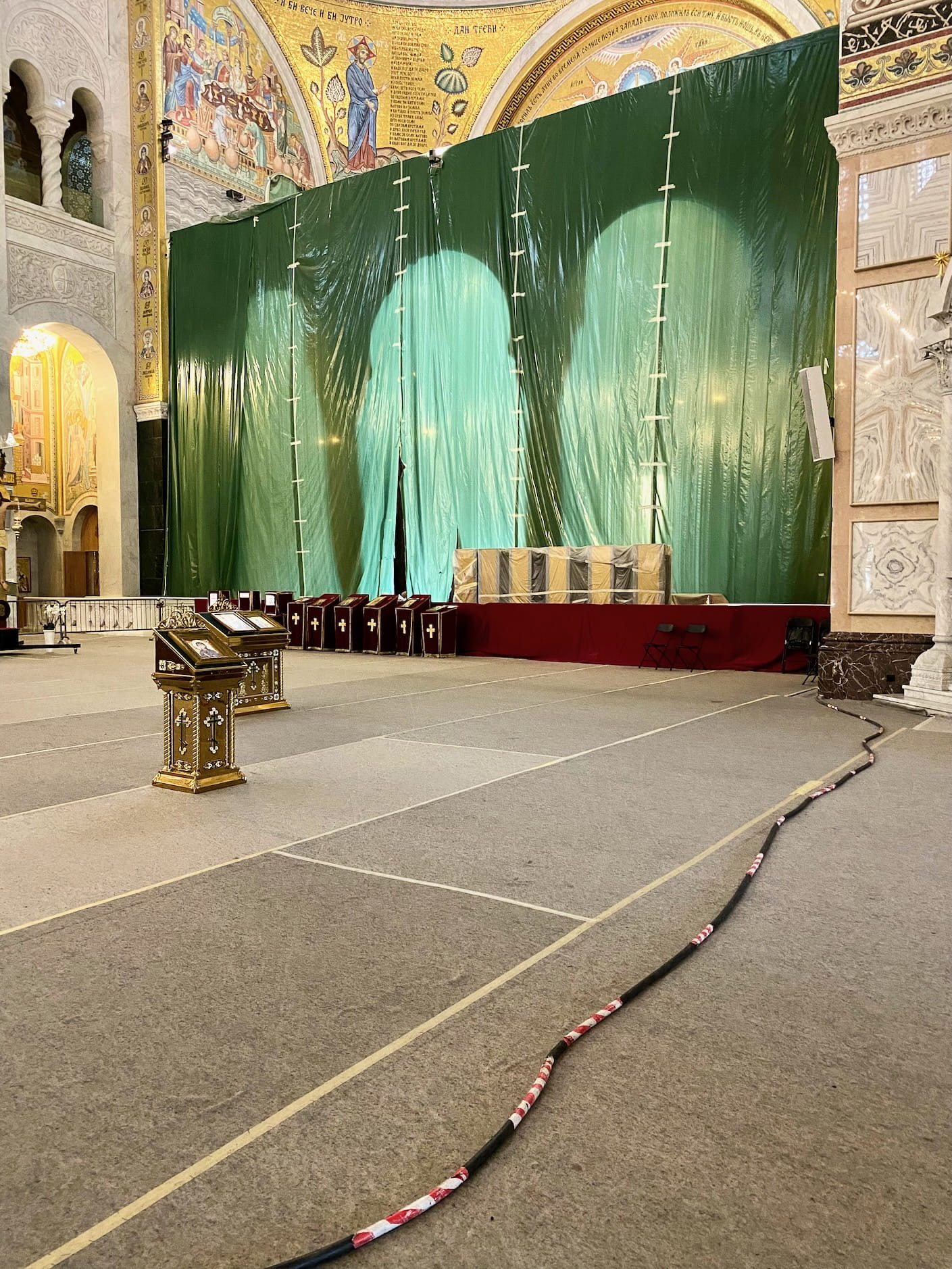 Towering on the outside. Inside, a ceiling bursting with drawings and gold plating. But then… there’s all this empty space. Nobody’s using it for anything. And there’s this wall of construction, a big cord going across, random objects. And on the outside, scaffolding and piles of material.