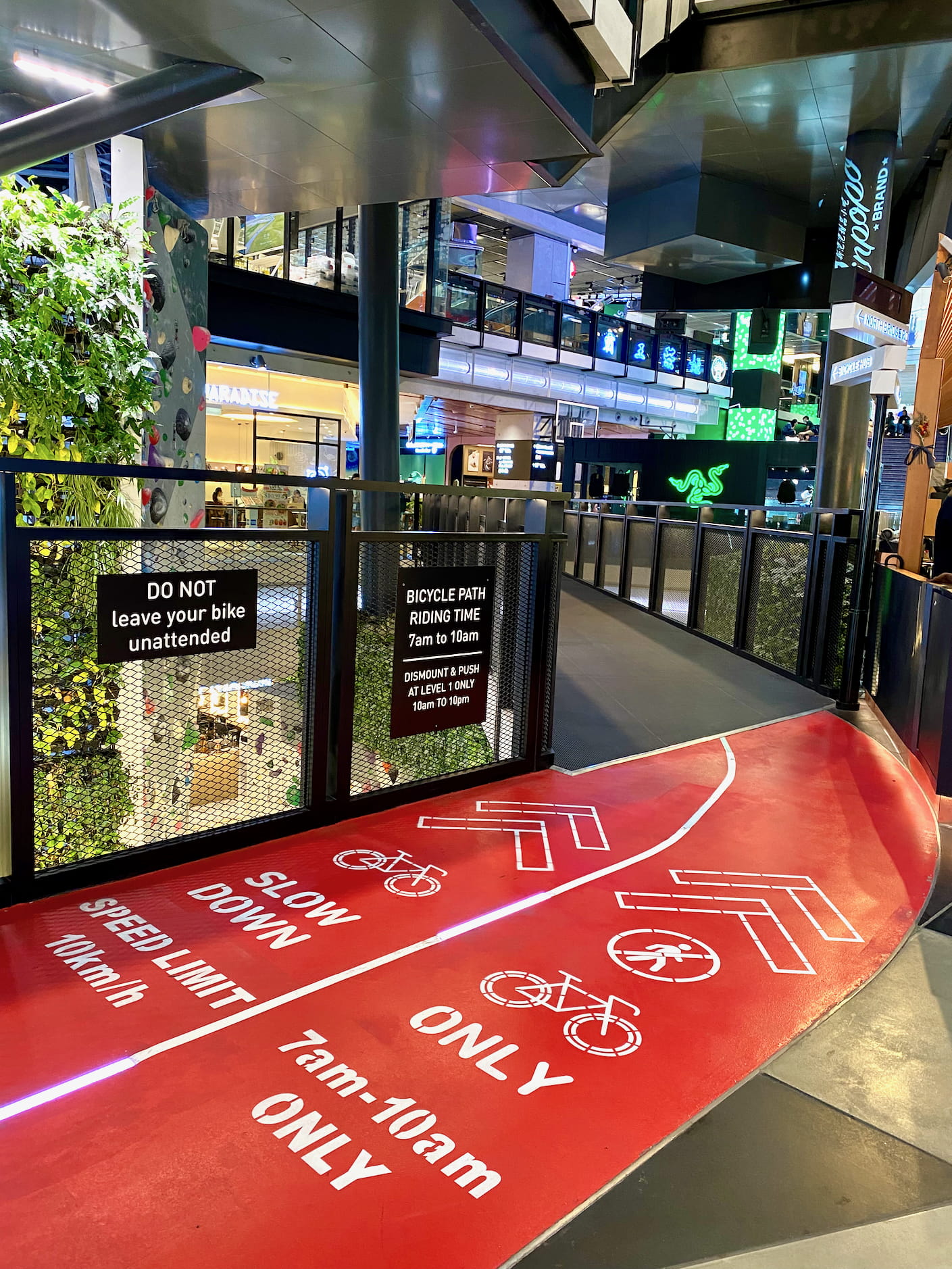 There were also both high-tech and cute design touches around, like automated bag drop machines at the airport, this indoor cycling track in a mall, and a children’s play area above plants.
