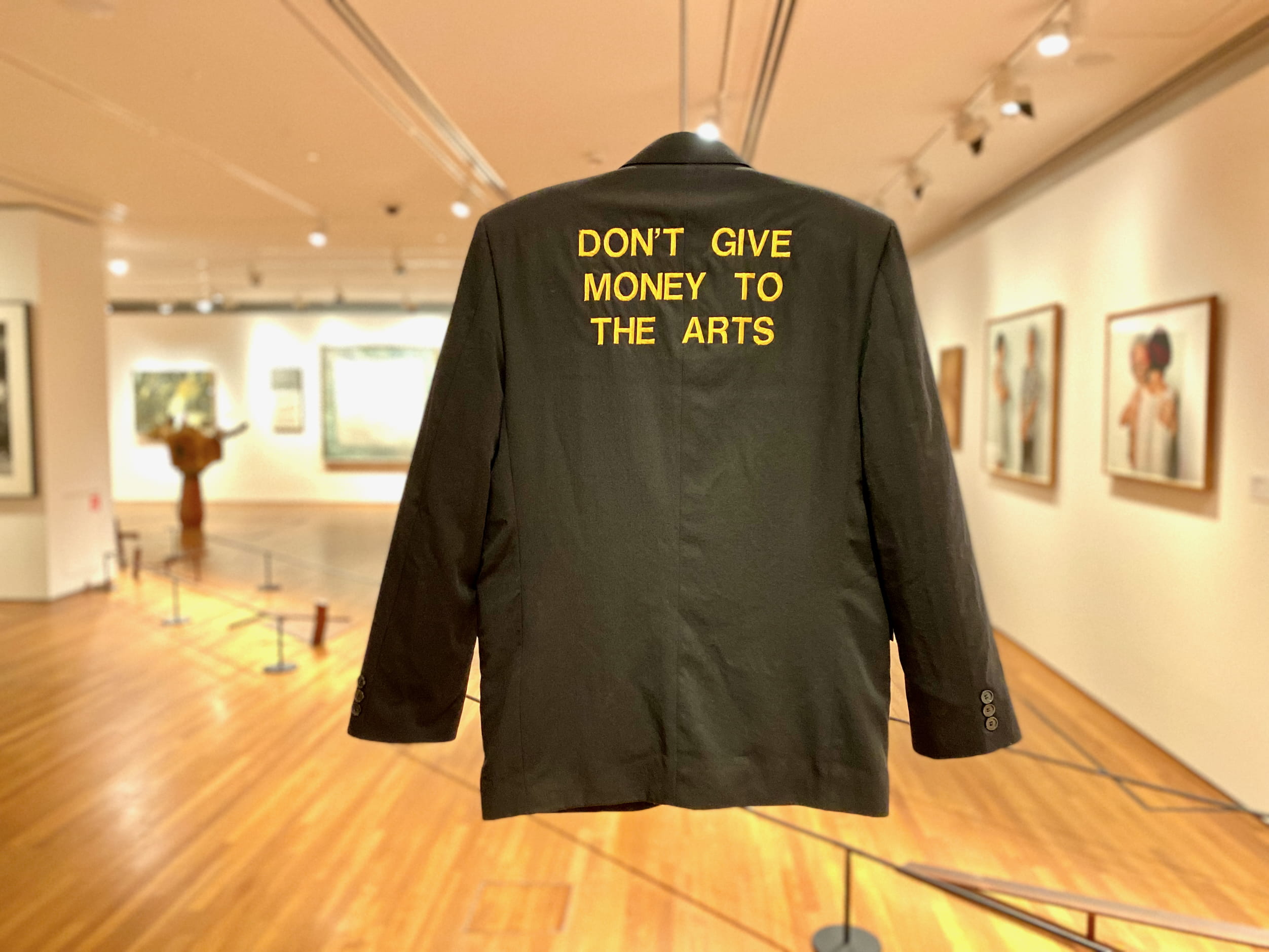 Pieces from the National Gallery were often pleasant but sanitary (above, a chair’s optical illusion), or ever so delicately mentioning the government’s unenthusaism for the arts, e.g., Tang Da Wu’s 1995 jacket from the period when performance art was illegal.