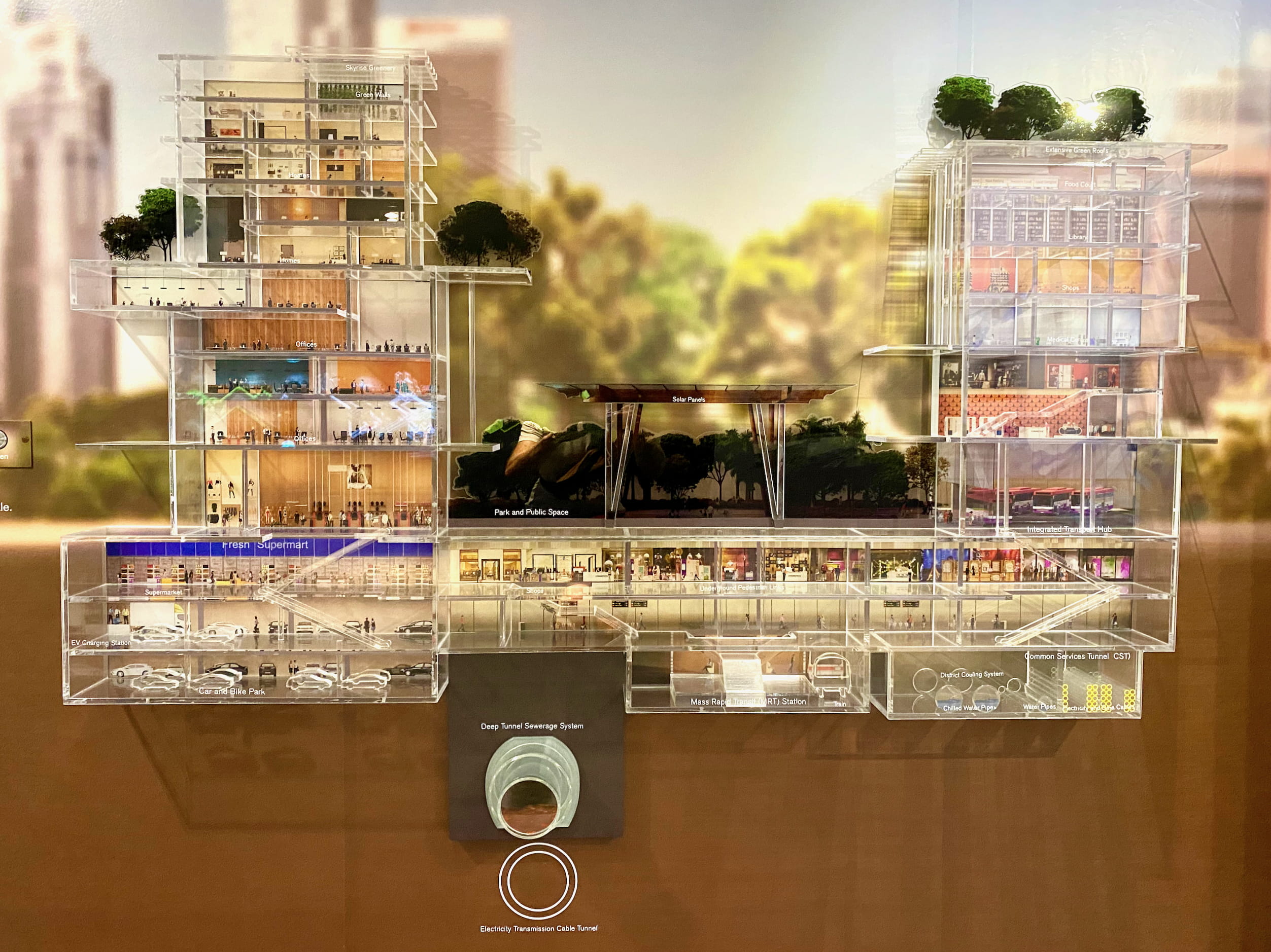 This leads to both immensely pleasing land use schemes and shared infrastructure. The land use puts space hungry—but briefly visited—things underground, like parking lots, supermarkets, mass transit, and utilities. This, plus vertical building, allows light in living and working spaces, and makes room for greenery. And the shared infrastructure has stuff like pipes distributing district-wide air conditioning and chilled water, which is more efficient than everyone individually producing their own.