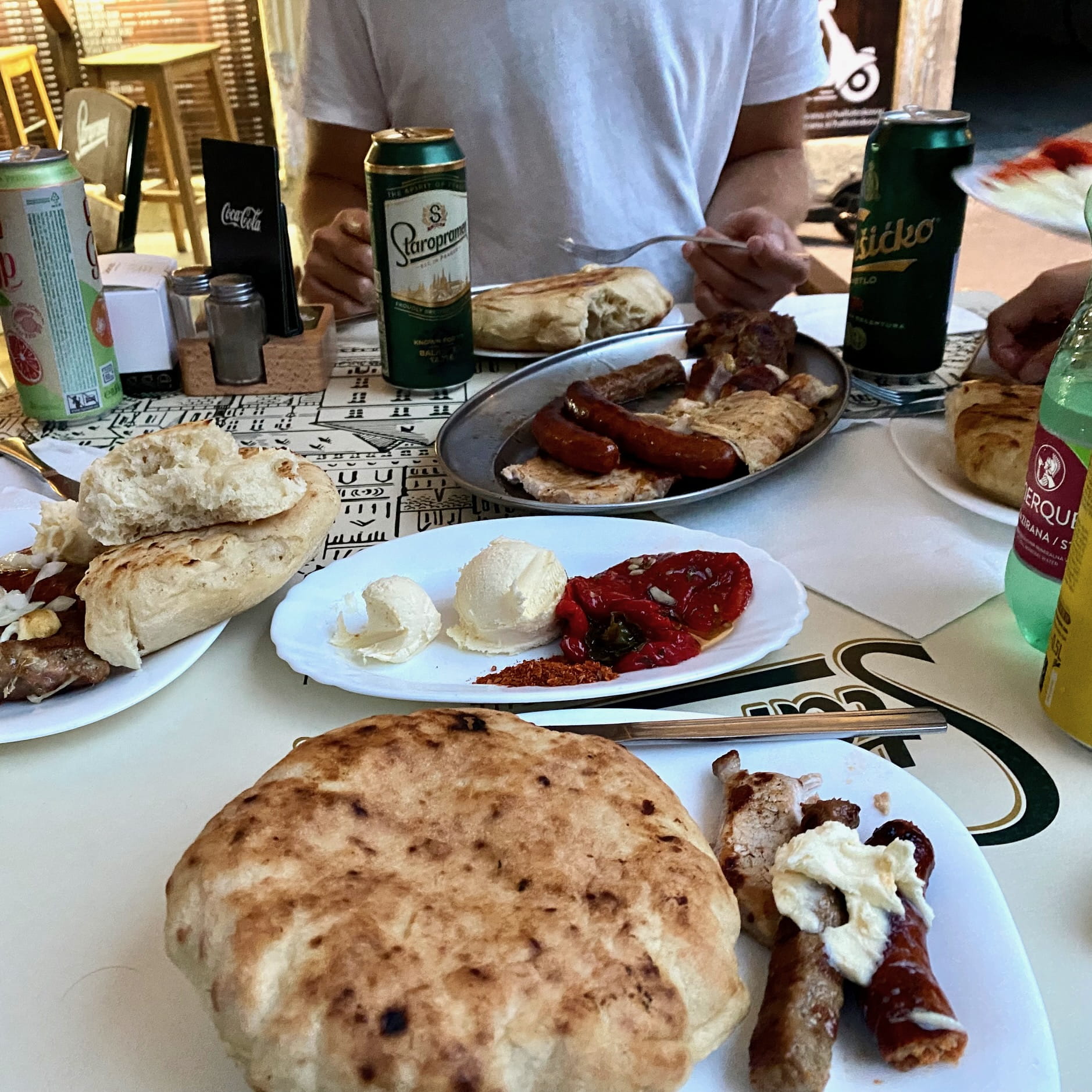 Top: Left: You can eat horse. I am sad to report that I did not eat horse. Hot Horse was closed. Bottom: Right: I did eat a bunch of ćevapčići. Sausages w/ flatbread, accompanied by grilled onions + peppers and creamy cheese. Delicious. This is apparently Serbian / Bosnian food, but is a staple in Slovenia. Traditional Slovenian food, I am told, is kind of Alps-esque: meat, potatoes, stew.