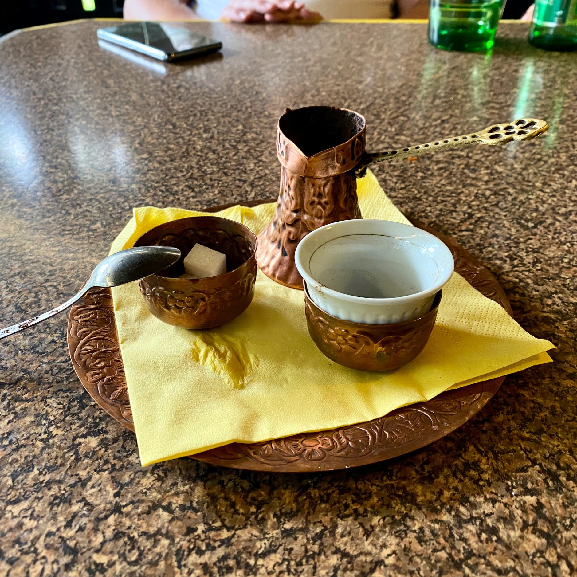 I had not realized it, but I’d never had Turkish coffee before. For some reason I had in my brain that a moka pot was Turkish coffee. Anyway, it is prepared by dumping coffee grounds and hot water in this adorable container with side spout. You don’t filter it, you just don’t pour the dregs. Tasty and top marks for presentation. This was at a restaurant where they informed us the village didn’t have running water that day so we couldn’t use the toilet, etc. (How were they doing the dishes?)