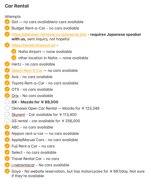 By the end of it, the only cars we could find were were novelty luxury car rentals you’d use for a stunt to, e.g., impress someone who is impressed by novelty luxury cars. They started at 3x the usual rental price we’d get in Japan, and went up from there.