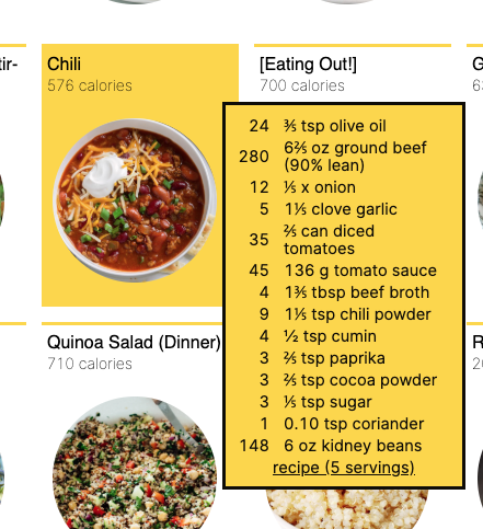So, what about meal planning apps? They have the opposite problem: they don’t have any interest in calorie counting. Calories often aren’t available at all. When they are, they’re often estimates, and are never shown per-ingredient. You can’t afford guesswork when you really care about hitting numeric goals. Knowing calories per-ingredient is vital when you want to make a bigger meal or make it more satiating. As soon as you have to tweak something yourself, you need to break back out into a spreadsheet.