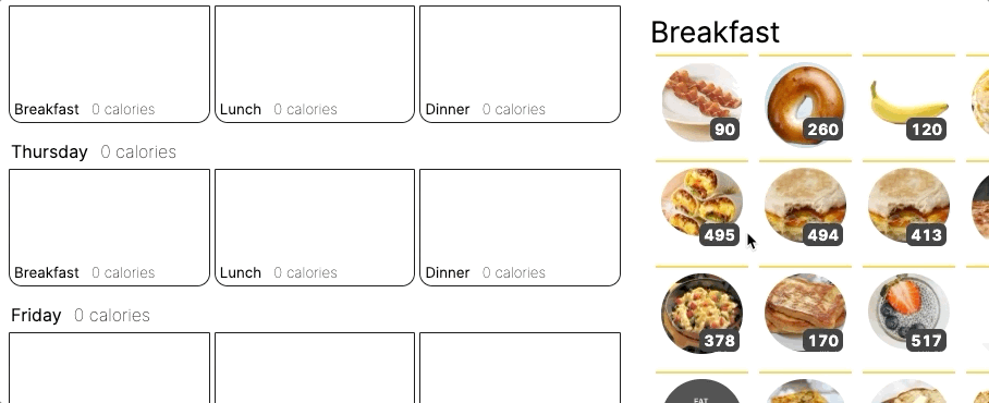 The dishes are on the right, and you drag and drop them into the meal slots for the upcoming week: