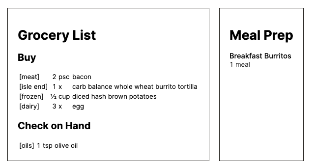 But when your hammer is programming, repetitive tasks look like nails. I was looking up the same ingredients multiple times. I’d copy and paste meals I had already put together. I’d manually look through the week to compile a grocery list. I wished I had an inventory of the meals I liked to cook, and the calories for common ingredients. If only I could automate some parts of this…