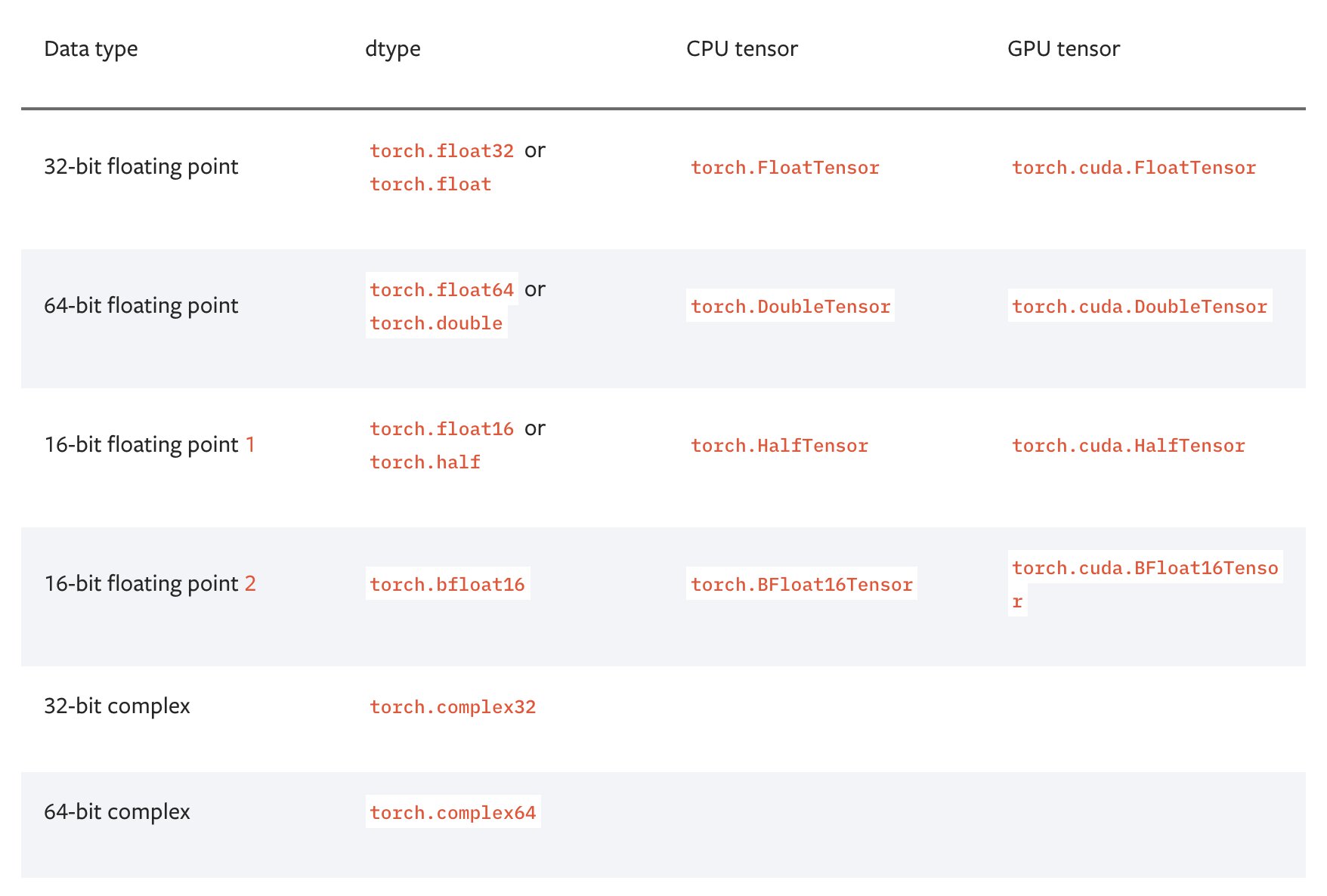 The list of tensor types available in PyTorch has exploded a bit—right now it still says there are ten tensor types, but by my counting, the table has seventeen rows—but I still like that they’re all there in one place.
