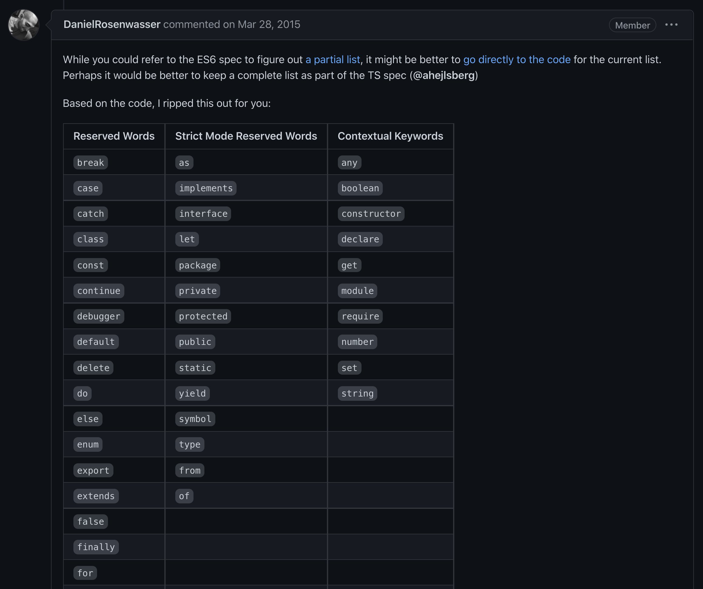 In this GitHub issue, somebody asked what the list of reserved keywords in TypeScript were.