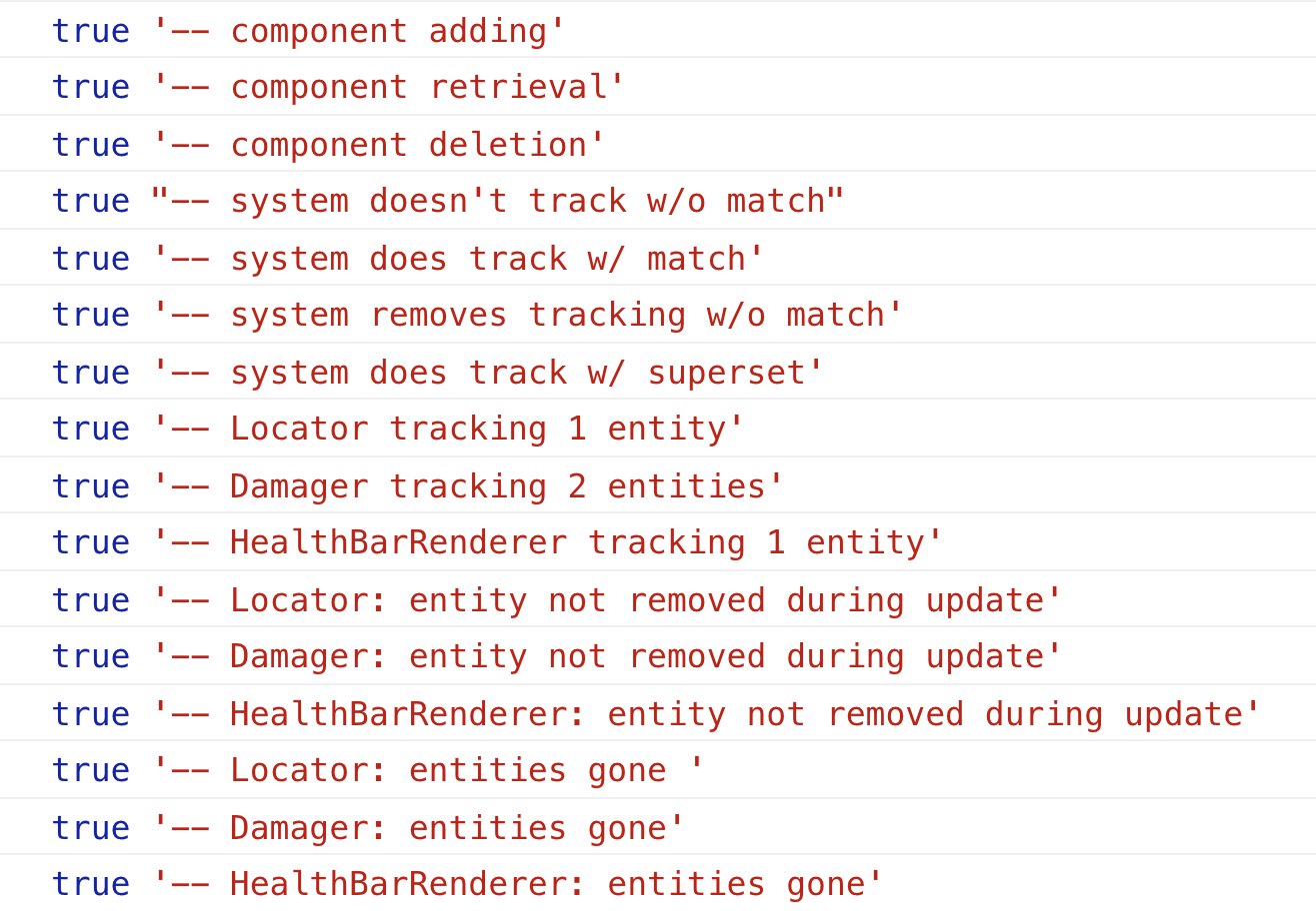 To set up our tests, I’m going to define some Components and Systems. Both Components just store data. The Systems will expose a public field called entitiesSeenLastUpdate, which they’ll update during their update(). We’ll use that to check that the Systems are seeing the Entities we expect them to. (Except for the Destroyer System, which we’ll just use to remove our Entities.)